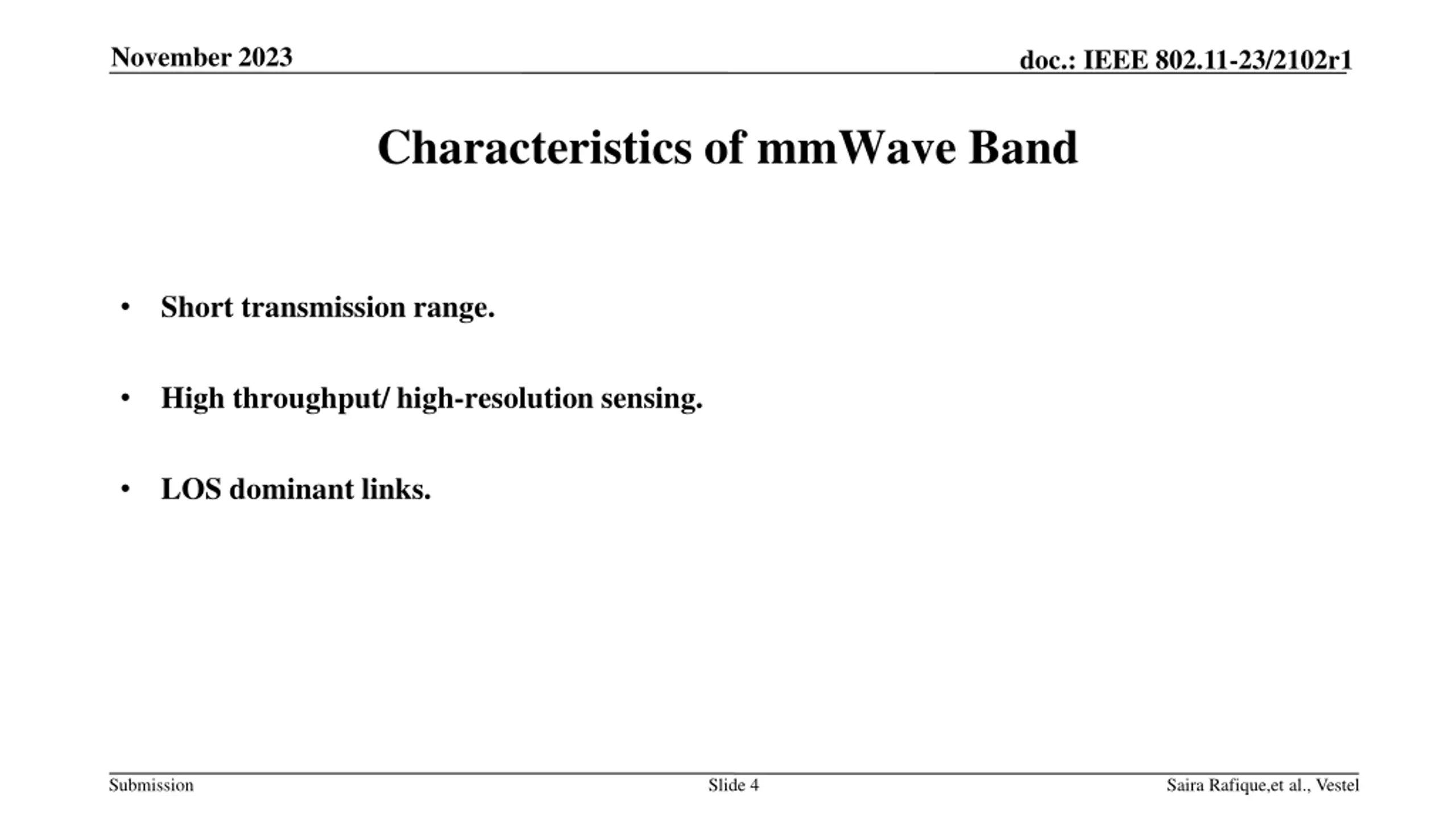 November 2023 doc.: IEEE 802.11-23/2102r1 Characteristics of mmWave Band Short transmission range. High throughput/ high-resolution sensing. LOS dominant links. Submission Slide 4 Saira Rafique,et al., Vestel