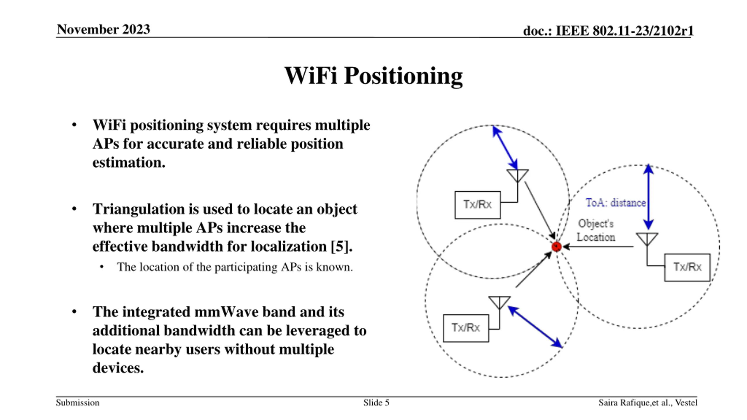 November 2023 doc.: IEEE 802.11-23/2102r1 WiFi Positioning WiFi positioning system requires multiple APs for accurate and reliable position estimation. Triangulation is used to locate an object where multiple APs increase the effective bandwidth for localization [5]. The location of the participating APs is known. The integrated mmWave band and its additional bandwidth can be leveraged to locate nearby users without multiple devices. Submission Slide 5 Saira Rafique,et al., Vestel