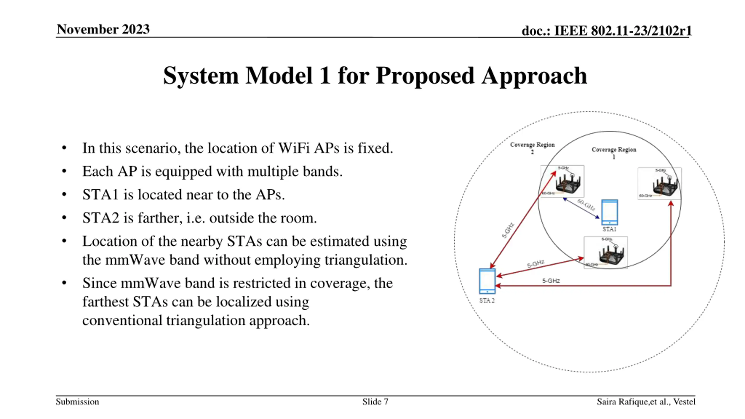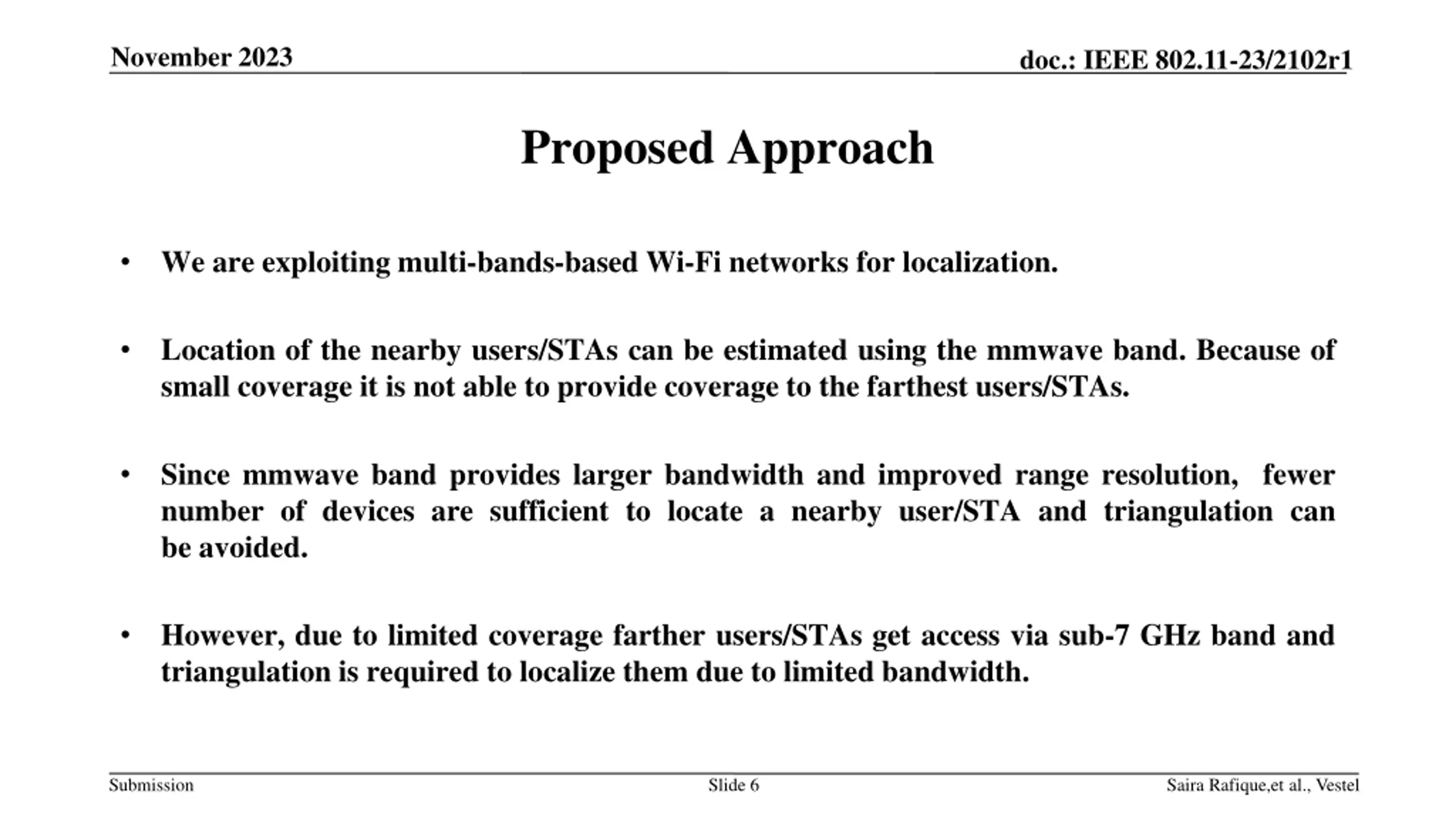 November 2023 doc.: IEEE 802.11-23/2102r1 Proposed Approach We are exploiting multi-bands-based Wi-Fi networks for localization. Location of the nearby users/STAs can be estimated using the mmwave band. Because of small coverage it is not able to provide coverage to the farthest users/STAs. Since mmwave band provides larger bandwidth and improved range resolution, fewer number of devices are sufficient to locate a nearby user/STA and triangulation can be avoided. However, due to limited coverage farther users/STAs get access via sub-7 GHz band and triangulation is required to localize them due to limited bandwidth. Submission Slide 6 Saira Rafique,et al., Vestel