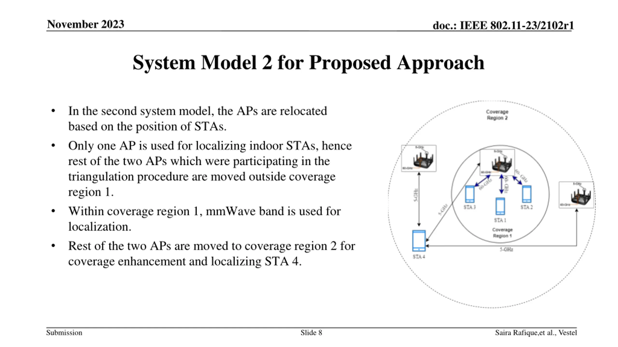 November 2023 doc.: IEEE 802.11-23/2102r1 System Model 2 for Proposed Approach In the second system model, the APs are relocated based on the position of STAs. Only one AP is used for localizing indoor STAs, hence rest of the two APs which were participating in the triangulation procedure are moved outside coverage region 1. Within coverage region 1, mmWave band is used for localization. Rest of the two APs are moved to coverage region 2 for coverage enhancement and localizing STA 4. Submission Slide 8 Saira Rafique,et al., Vestel