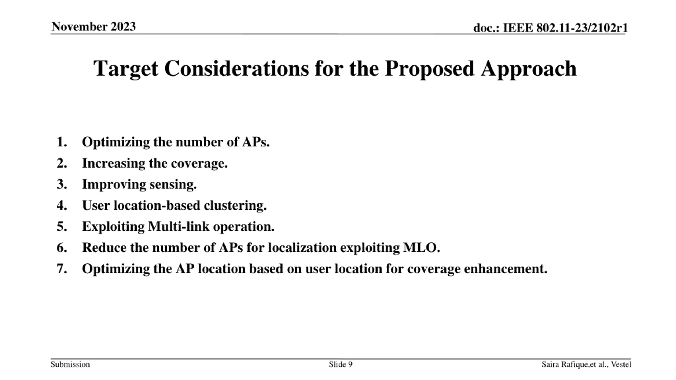 November 2023 doc.: IEEE 802.11-23/2102r1 Target Considerations for the Proposed Approach 1. 2. 3. 4. 5. 6. 7. Optimizing the number of APs. Increasing the coverage. Improving sensing. User location-based clustering. Exploiting Multi-link operation. Reduce the number of APs for localization exploiting MLO. Optimizing the AP location based on user location for coverage enhancement. Submission Slide 9 Saira Rafique,et al., Vestel