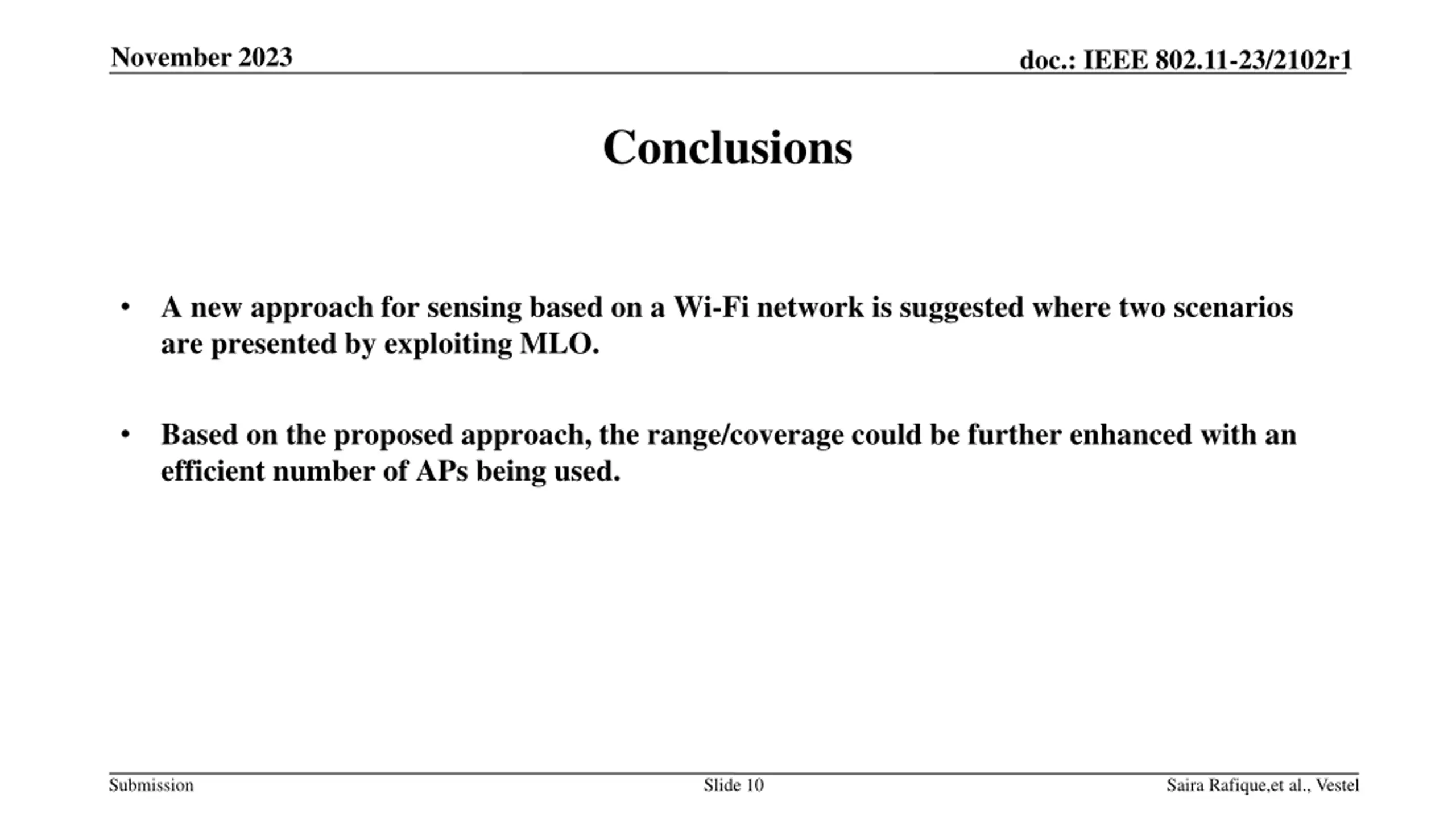November 2023 doc.: IEEE 802.11-23/2102r1 Conclusions A new approach for sensing based on a Wi-Fi network is suggested where two scenarios are presented by exploiting MLO. Based on the proposed approach, the range/coverage could be further enhanced with an efficient number of APs being used. Submission Slide 10 Saira Rafique,et al., Vestel