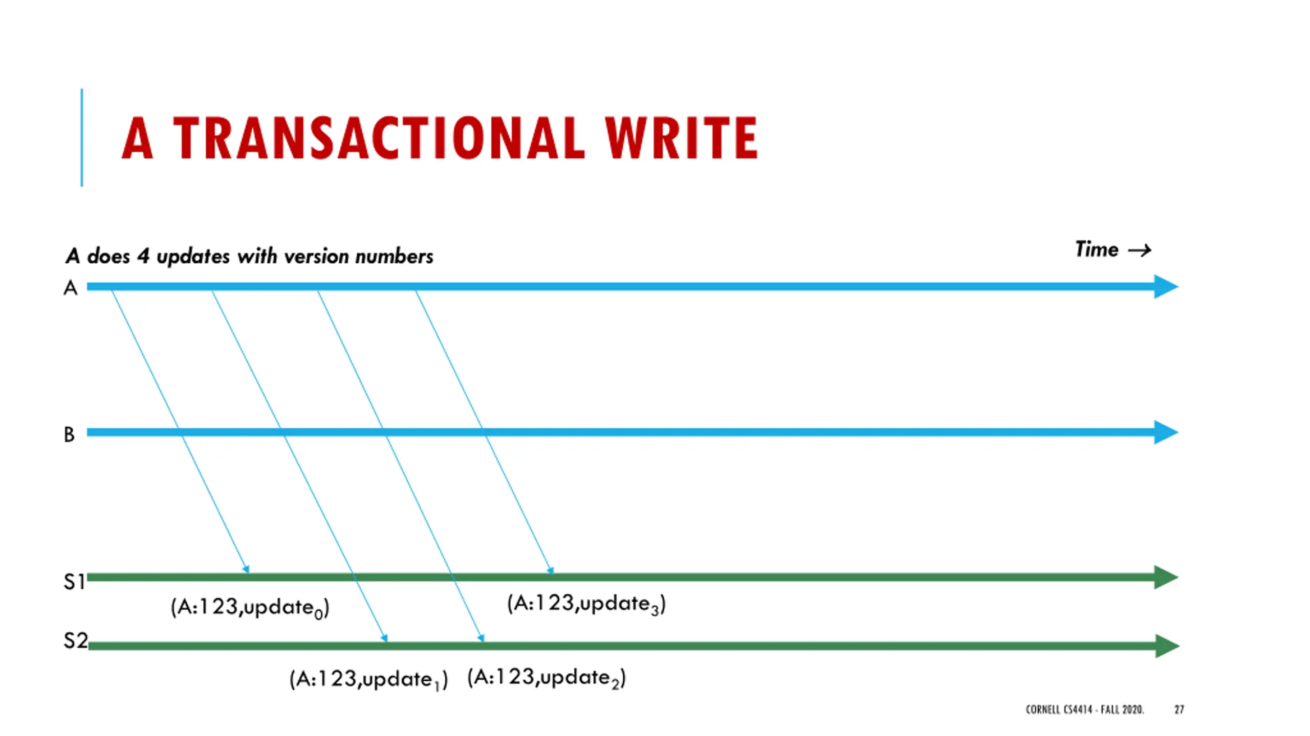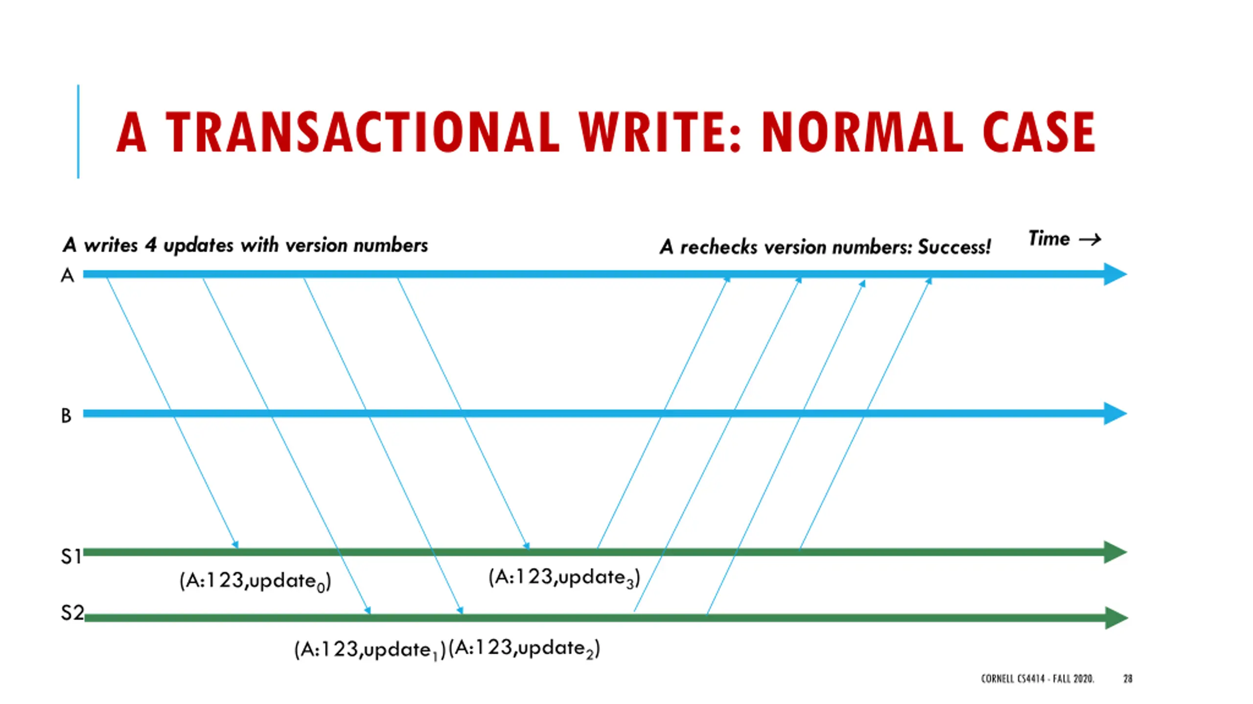 A TRANSACTIONAL WRITE Time A does 4 updates with version numbers A B S1 (A:123,update3) (A:123,update0) S2 (A:123,update1) (A:123,update2) CORNELL CS4414 - FALL 2020. 27