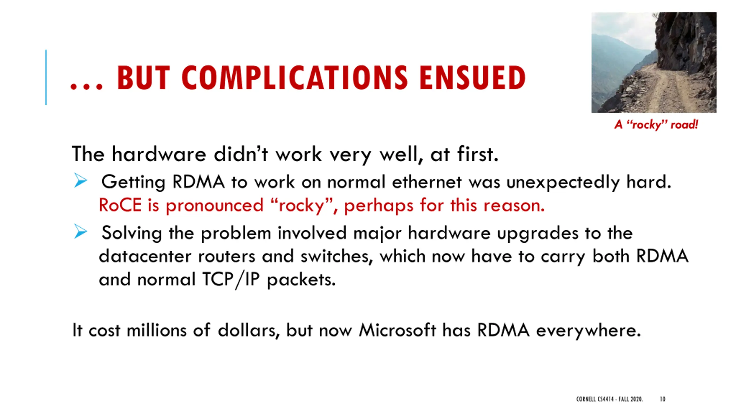 BUT COMPLICATIONS ENSUED A rocky road! The hardware didn t work very well, at first. Getting RDMA to work on normal ethernet was unexpectedly hard. RoCE is pronounced rocky , perhaps for this reason. Solving the problem involved major hardware upgrades to the datacenter routers and switches, which now have to carry both RDMA and normal TCP/IP packets. It cost millions of dollars, but now Microsoft has RDMA everywhere. CORNELL CS4414 - FALL 2020. 10