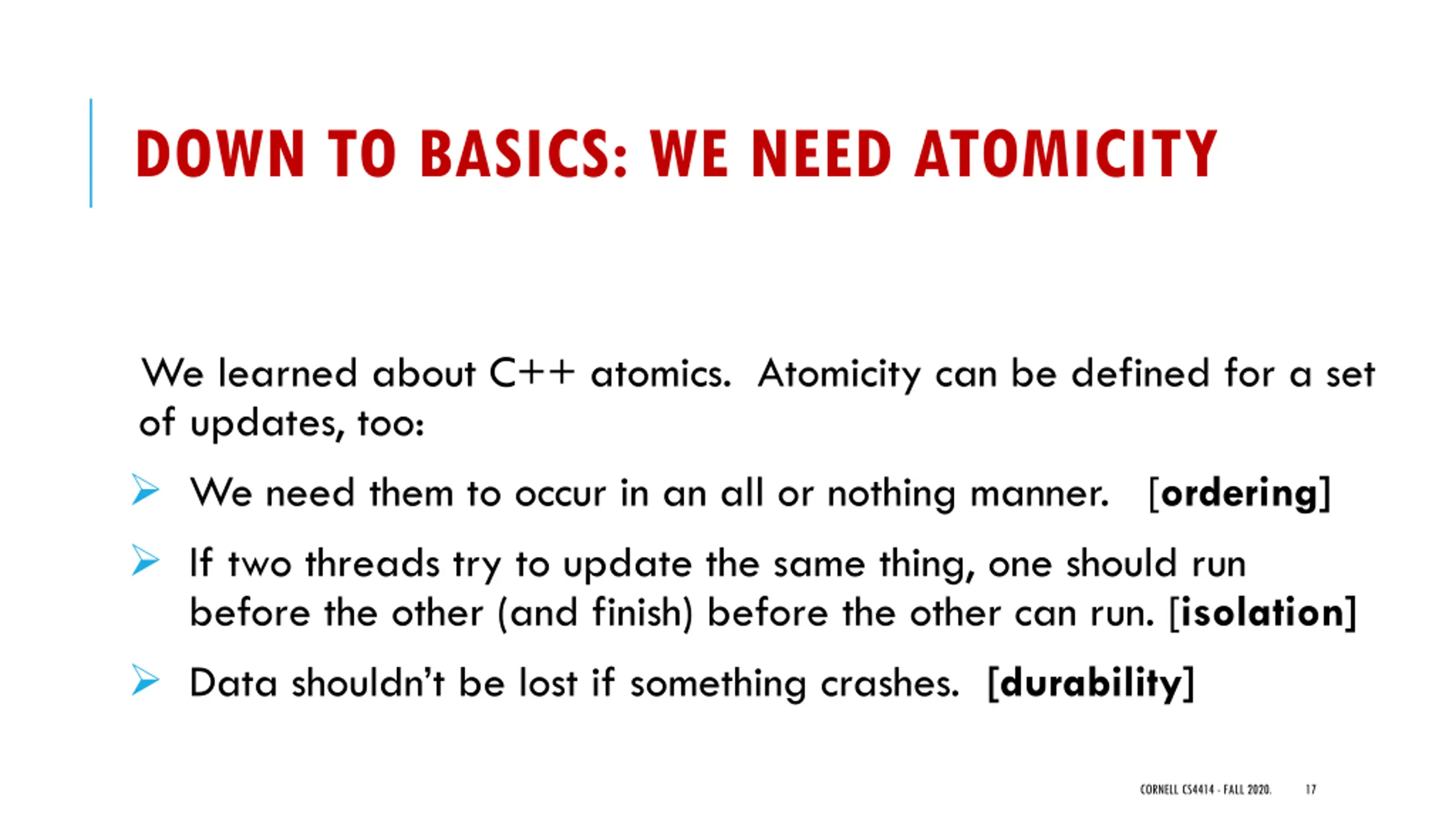 DOWN TO BASICS: WE NEED ATOMICITY We learned about C++ atomics. Atomicity can be defined for a set of updates, too: We need them to occur in an all or nothing manner. [ordering] If two threads try to update the same thing, one should run before the other (and finish) before the other can run. [isolation] Data shouldn t be lost if something crashes. [durability] CORNELL CS4414 - FALL 2020. 17