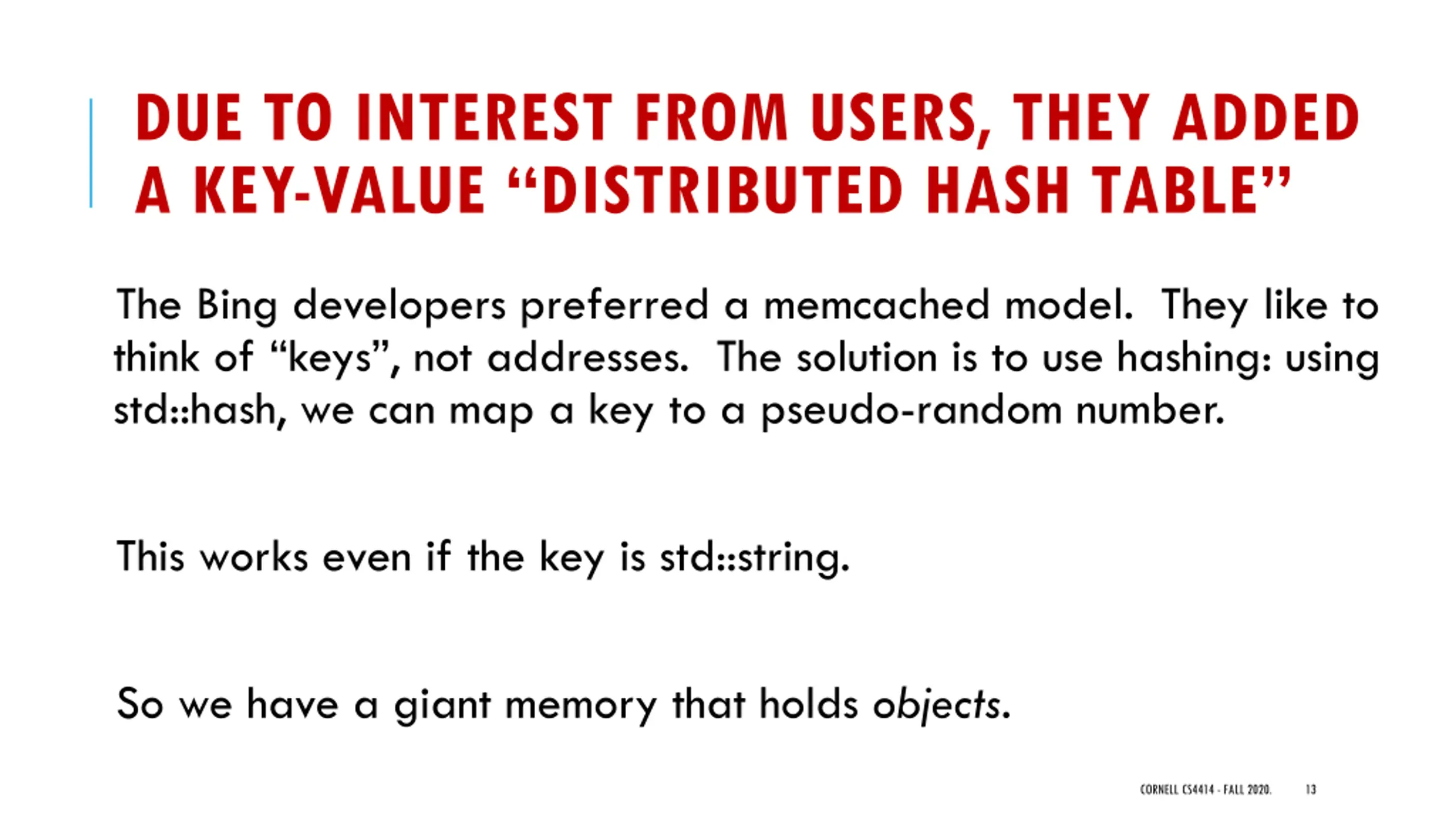 DUE TO INTEREST FROM USERS, THEY ADDED A KEY-VALUE DISTRIBUTED HASH TABLE The Bing developers preferred a memcached model. They like to think of keys , not addresses. The solution is to use hashing: using std::hash, we can map a key to a pseudo-random number. This works even if the key is std::string. So we have a giant memory that holds objects. CORNELL CS4414 - FALL 2020. 13