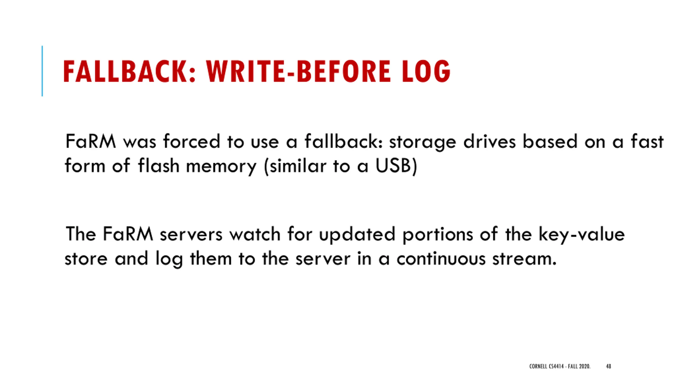 FALLBACK: WRITE-BEFORE LOG FaRM was forced to use a fallback: storage drives based on a fast form of flash memory (similar to a USB) The FaRM servers watch for updated portions of the key-value store and log them to the server in a continuous stream. CORNELL CS4414 - FALL 2020. 48