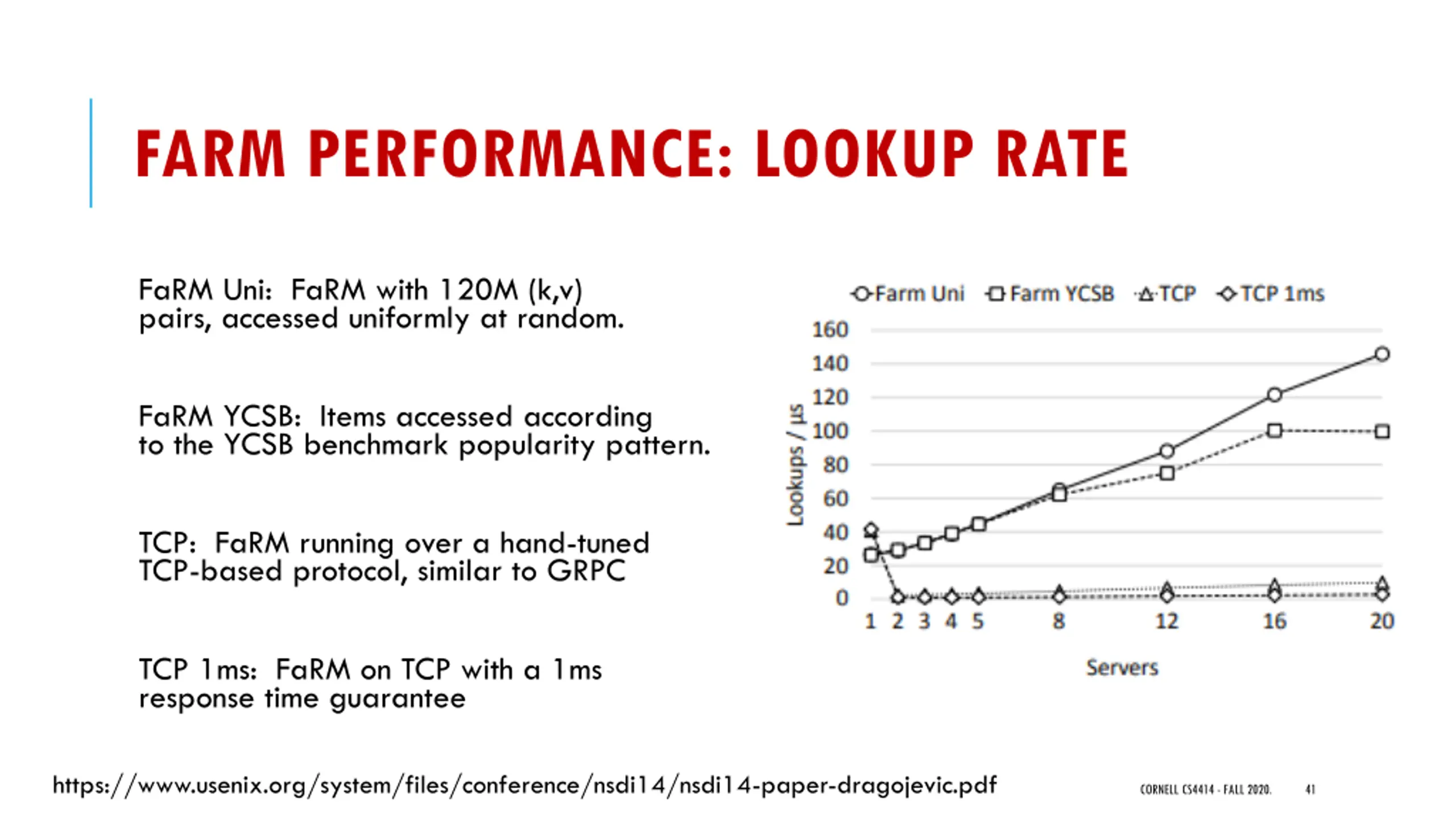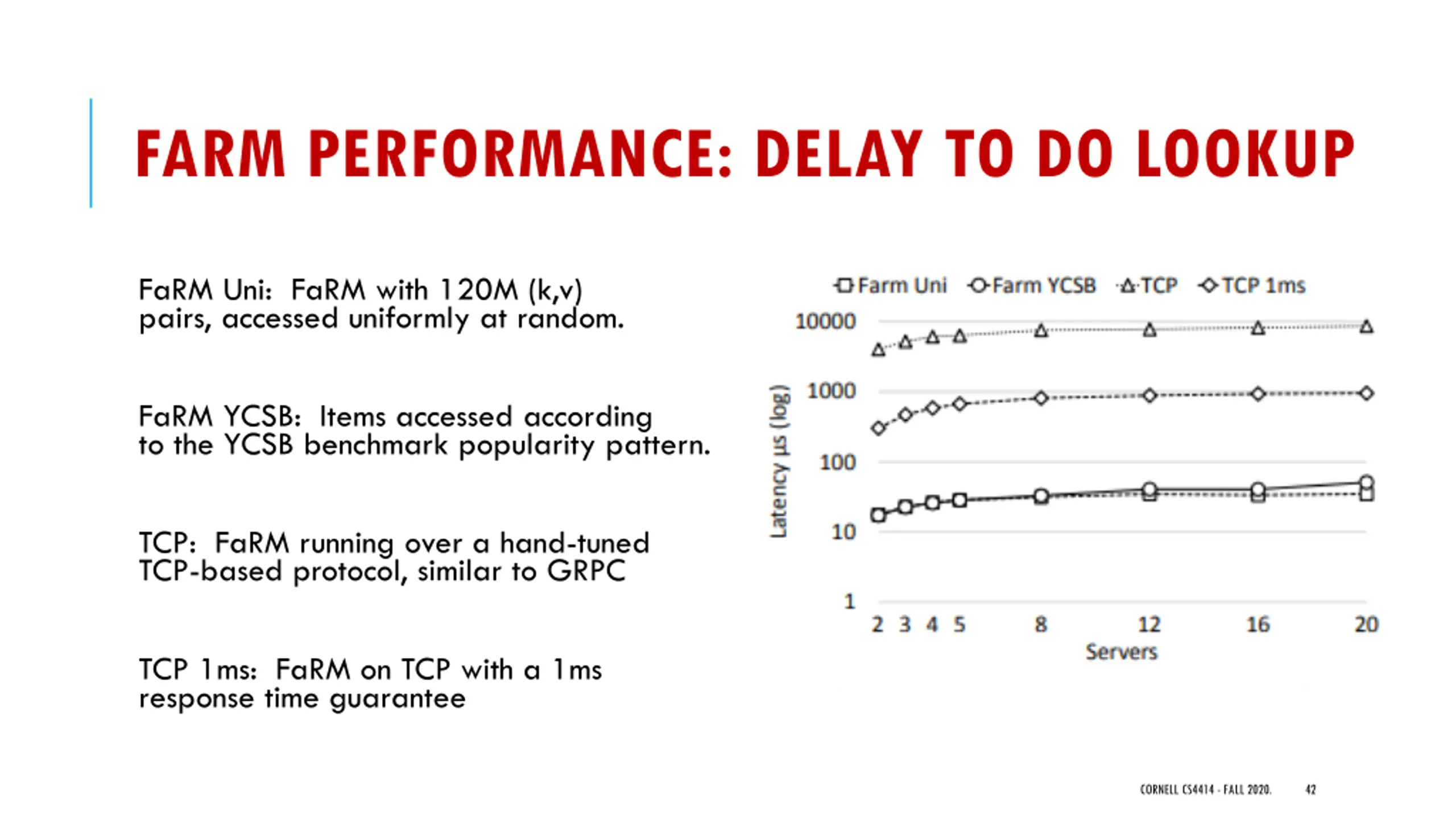 FARM PERFORMANCE: LOOKUP RATE FaRM Uni: FaRM with 120M (k,v) pairs, accessed uniformly at random. FaRM YCSB: Items accessed according to the YCSB benchmark popularity pattern. TCP: FaRM running over a hand-tuned TCP-based protocol, similar to GRPC TCP 1ms: FaRM on TCP with a 1ms response time guarantee https://www.usenix.org/system/files/conference/nsdi14/nsdi14-paper-dragojevic.pdf CORNELL CS4414 - FALL 2020. 41