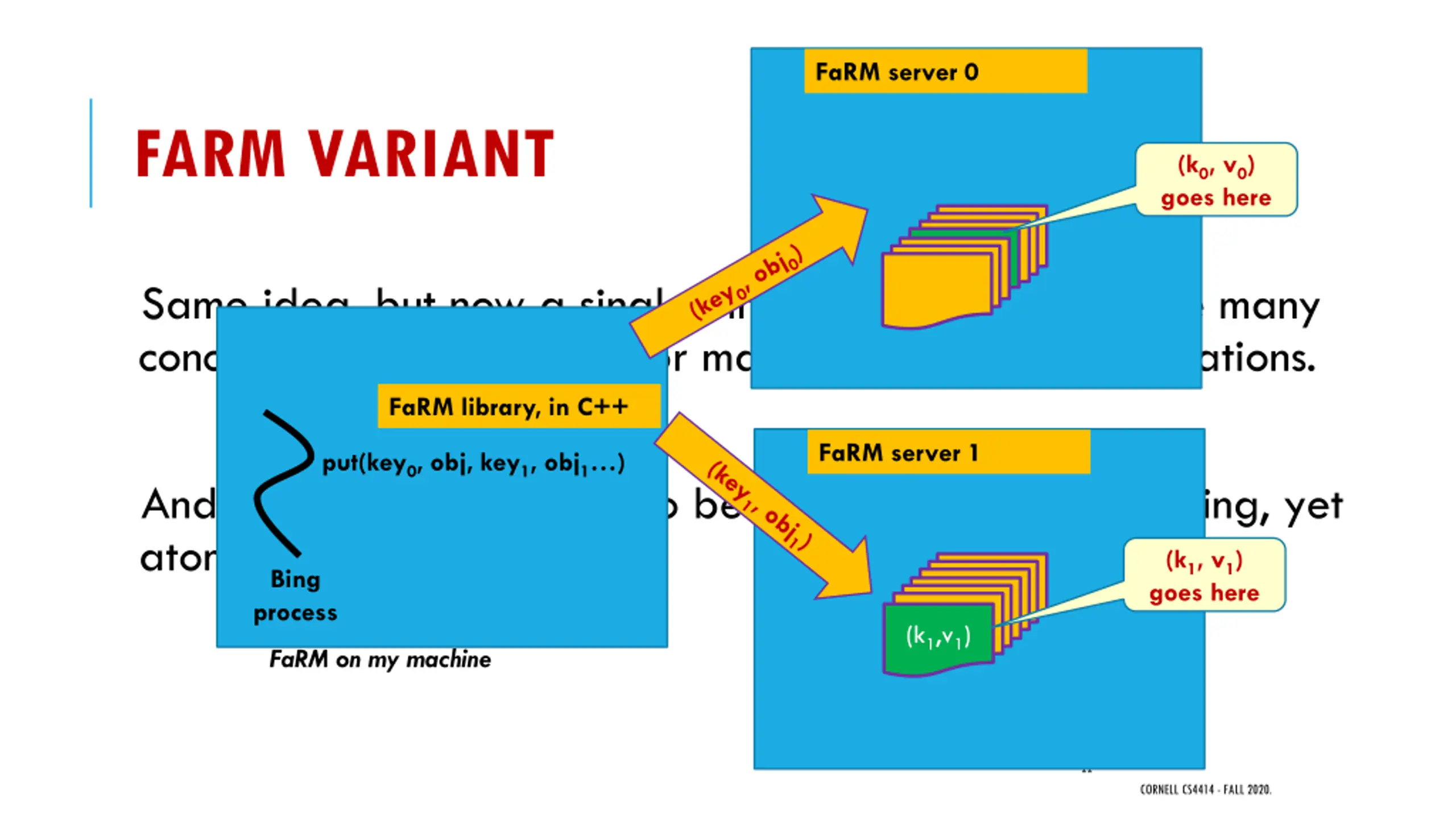 FaRM server 0 FARM VARIANT (k0, v0) goes here Same idea, but now a single Bing update could require many concurrent put operations, or many concurrent get operations. FaRM library, in C++ FaRM server 1 put(key0, obj, key1, obj1 ) And those are what need to be concurrent, without locking, yet atomic. Bing process (k1, v1) goes here (k1,v1) FaRM on my machine 22 CORNELL CS4414 - FALL 2020.