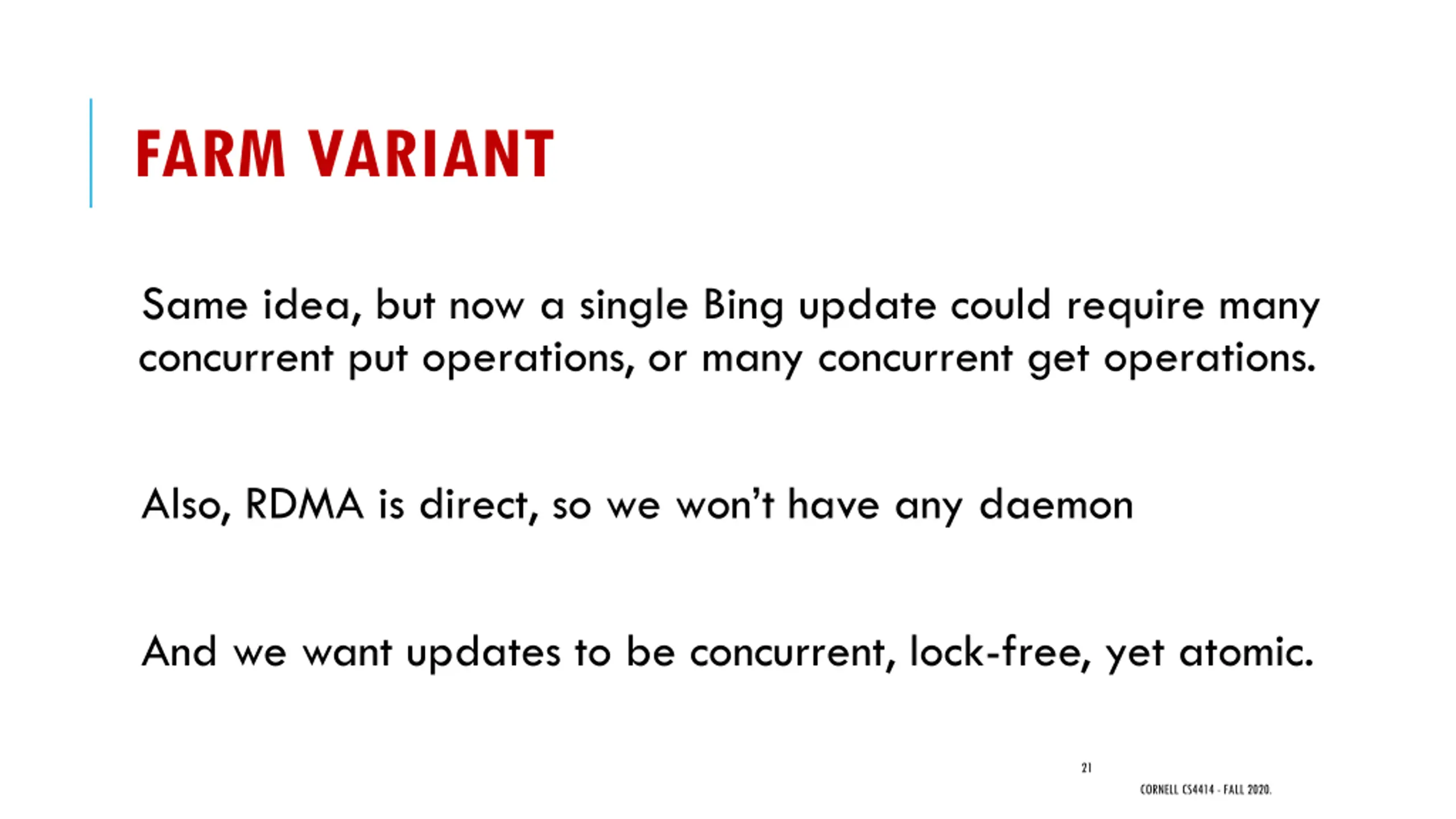 FARM VARIANT Same idea, but now a single Bing update could require many concurrent put operations, or many concurrent get operations. Also, RDMA is direct, so we won t have any daemon And we want updates to be concurrent, lock-free, yet atomic. 21 CORNELL CS4414 - FALL 2020.