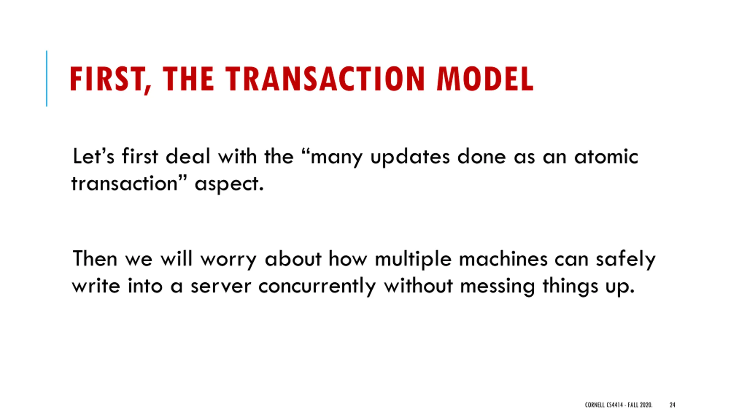 FIRST, THE TRANSACTION MODEL Let s first deal with the many updates done as an atomic transaction aspect. Then we will worry about how multiple machines can safely write into a server concurrently without messing things up. CORNELL CS4414 - FALL 2020. 24