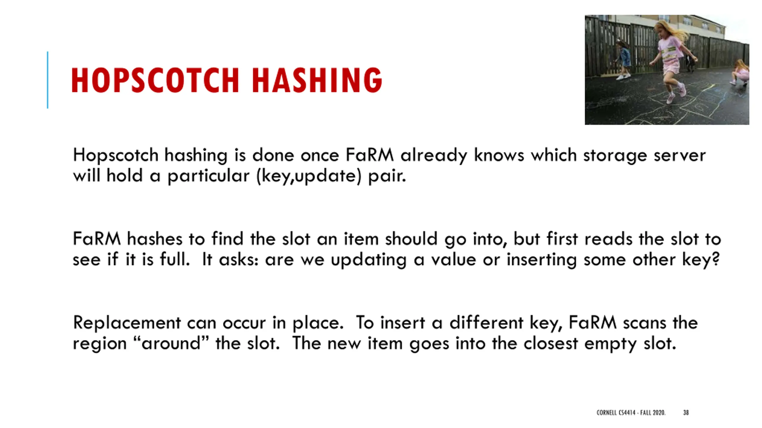 HOPSCOTCH HASHING Hopscotch hashing is done once FaRM already knows which storage server will hold a particular (key,update) pair. FaRM hashes to find the slot an item should go into, but first reads the slot to see if it is full. It asks: are we updating a value or inserting some other key? Replacement can occur in place. To insert a different key, FaRM scans the region around the slot. The new item goes into the closest empty slot. CORNELL CS4414 - FALL 2020. 38