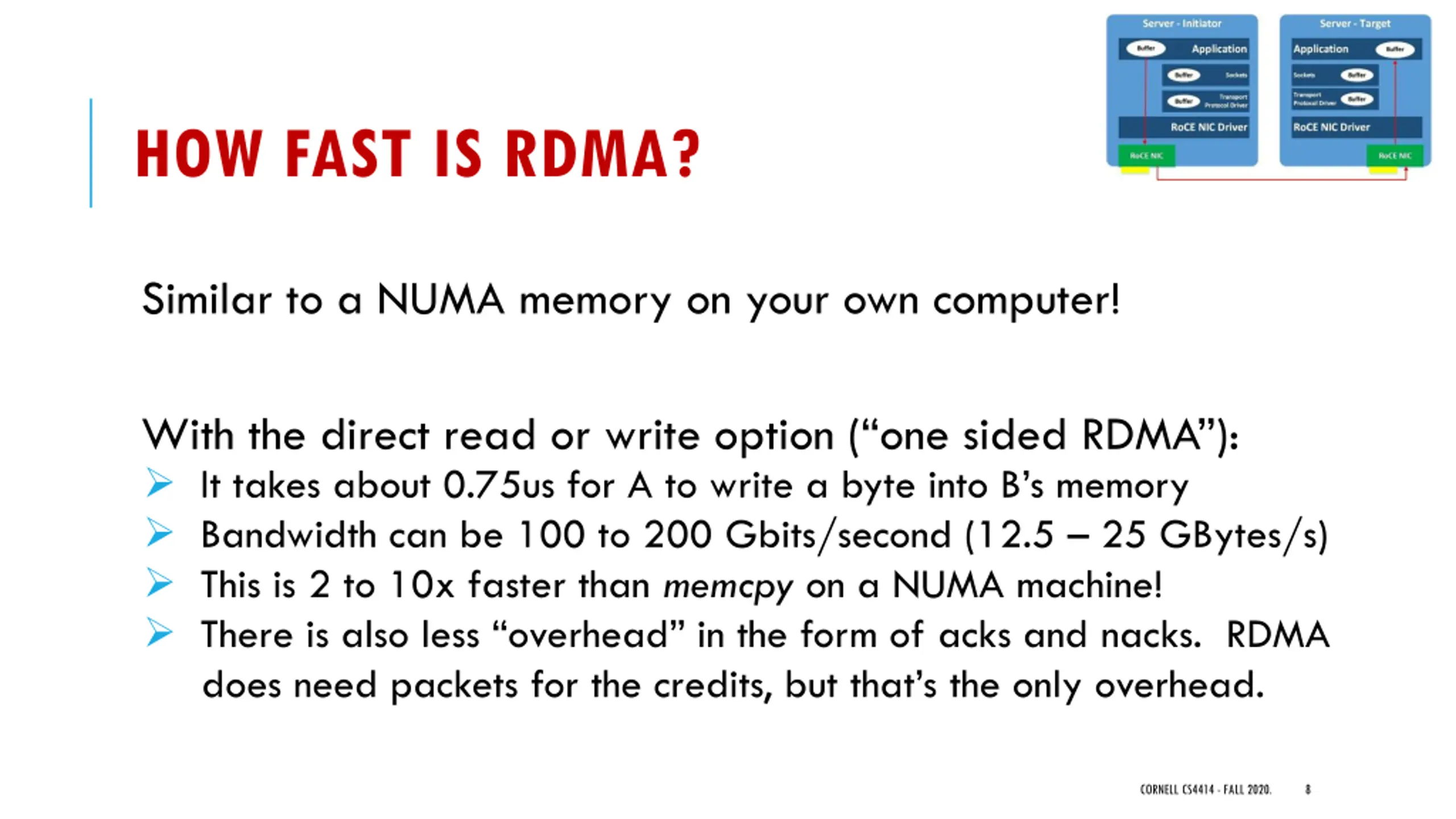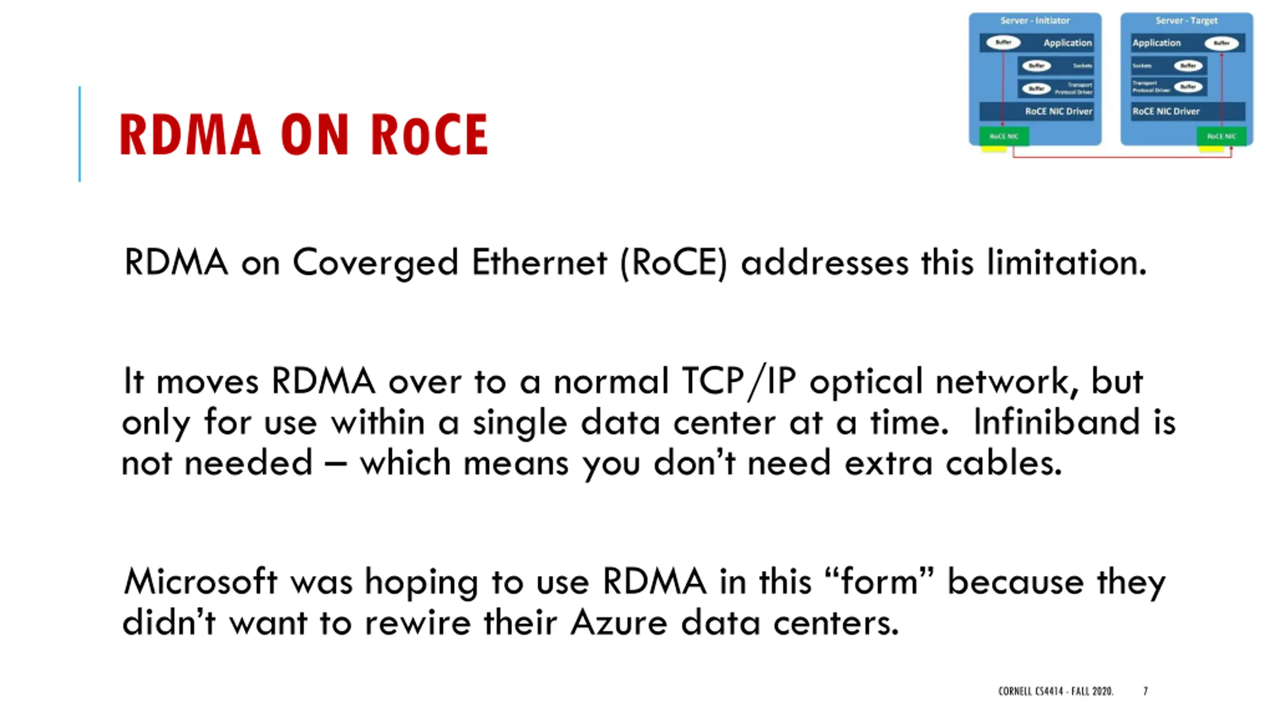 RDMA ON ROCE RDMA on Coverged Ethernet (RoCE) addresses this limitation. It moves RDMA over to a normal TCP/IP optical network, but only for use within a single data center at a time. Infiniband is not needed which means you don t need extra cables. Microsoft was hoping to use RDMA in this form because they didn t want to rewire their Azure data centers. CORNELL CS4414 - FALL 2020. 7
