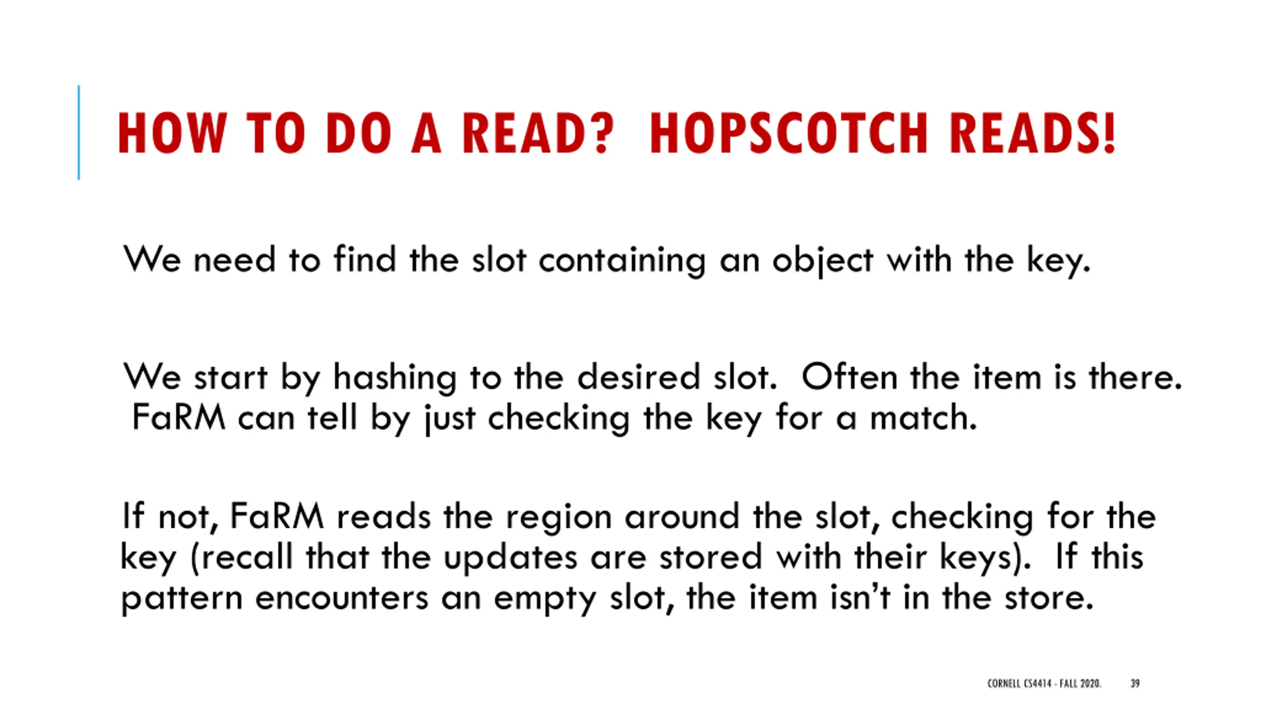 HOW TO DO A READ? HOPSCOTCH READS! We need to find the slot containing an object with the key. We start by hashing to the desired slot. Often the item is there. FaRM can tell by just checking the key for a match. If not, FaRM reads the region around the slot, checking for the key (recall that the updates are stored with their keys). If this pattern encounters an empty slot, the item isn t in the store. CORNELL CS4414 - FALL 2020. 39