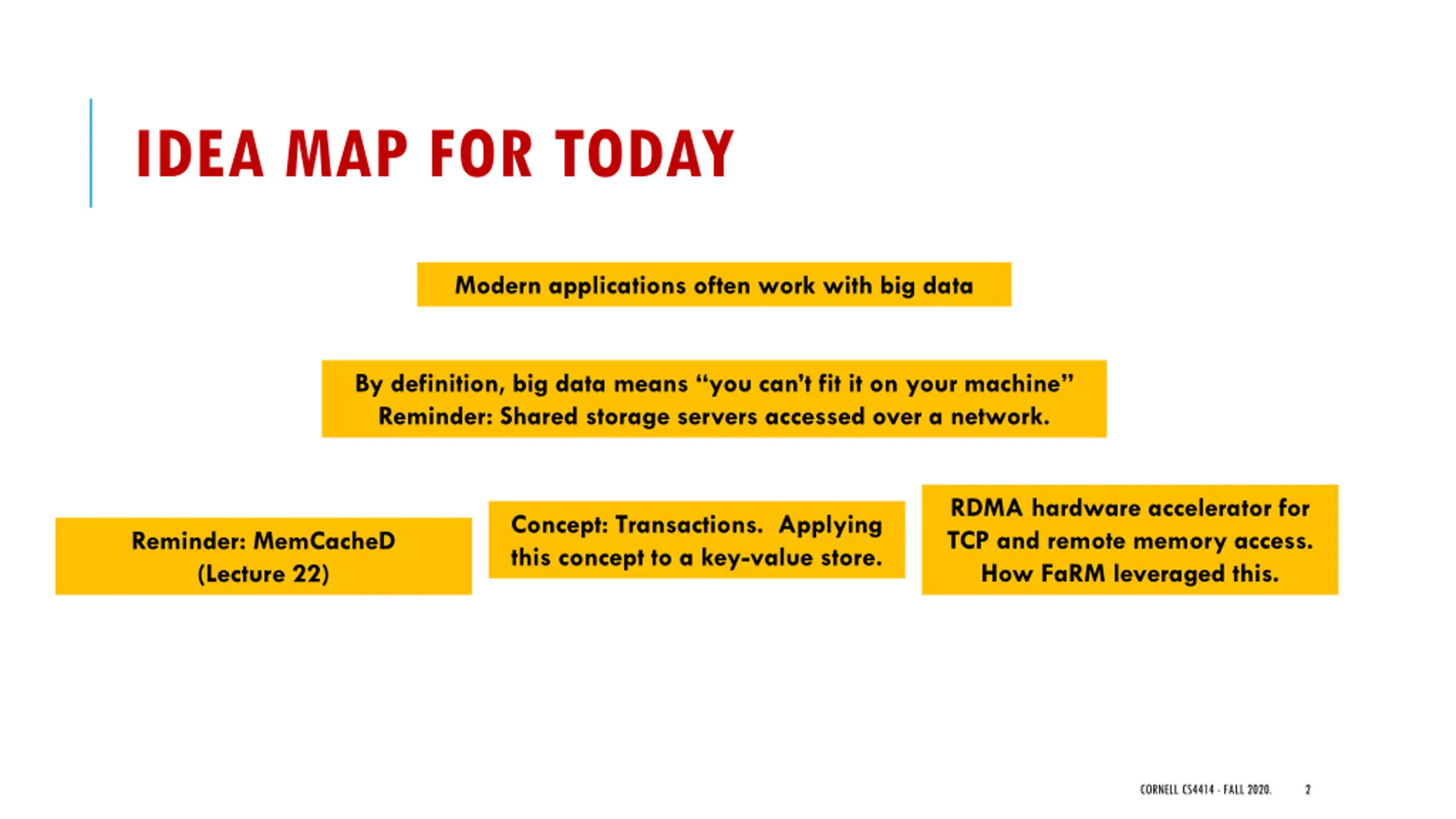 IDEA MAP FOR TODAY Modern applications often work with big data By definition, big data means you can t fit it on your machine Reminder: Shared storage servers accessed over a network. RDMA hardware accelerator for TCP and remote memory access. How FaRM leveraged this. Concept: Transactions. Applying this concept to a key-value store. Reminder: MemCacheD (Lecture 22) CORNELL CS4414 - FALL 2020. 2