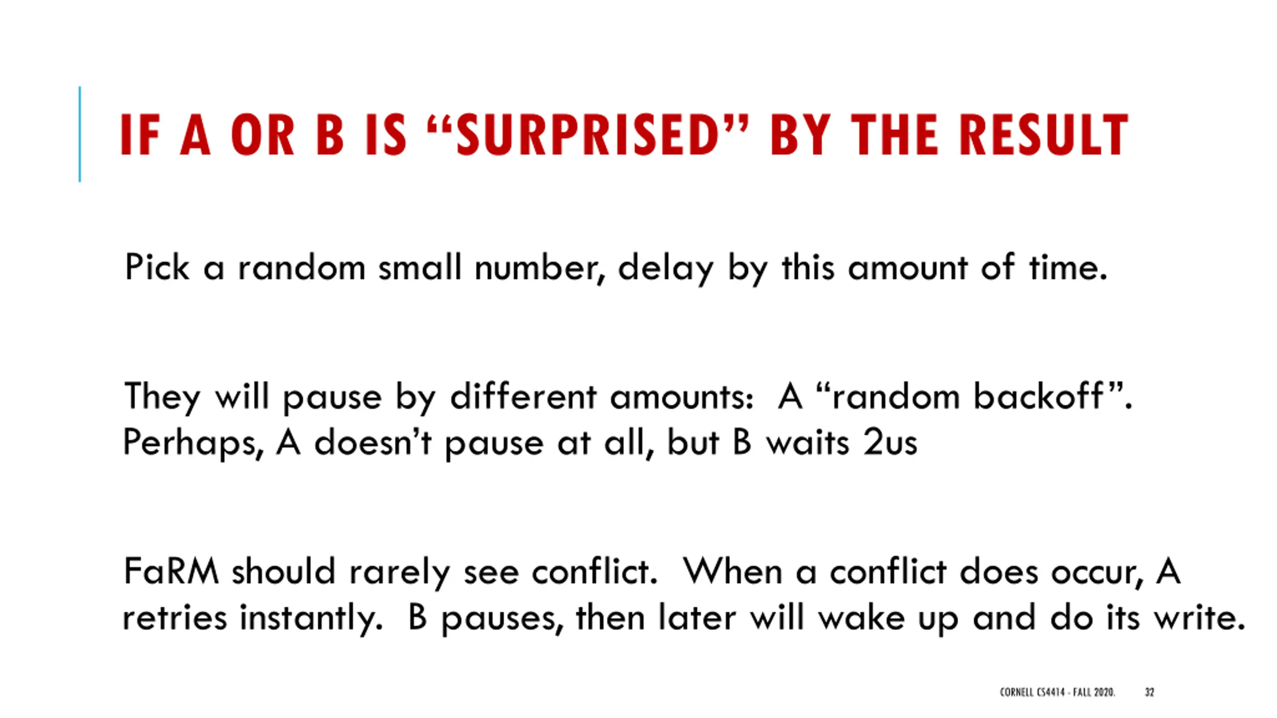 IF A OR B IS SURPRISED BY THE RESULT Pick a random small number, delay by this amount of time. They will pause by different amounts: A random backoff . Perhaps, A doesn t pause at all, but B waits 2us FaRM should rarely see conflict. When a conflict does occur, A retries instantly. B pauses, then later will wake up and do its write. CORNELL CS4414 - FALL 2020. 32