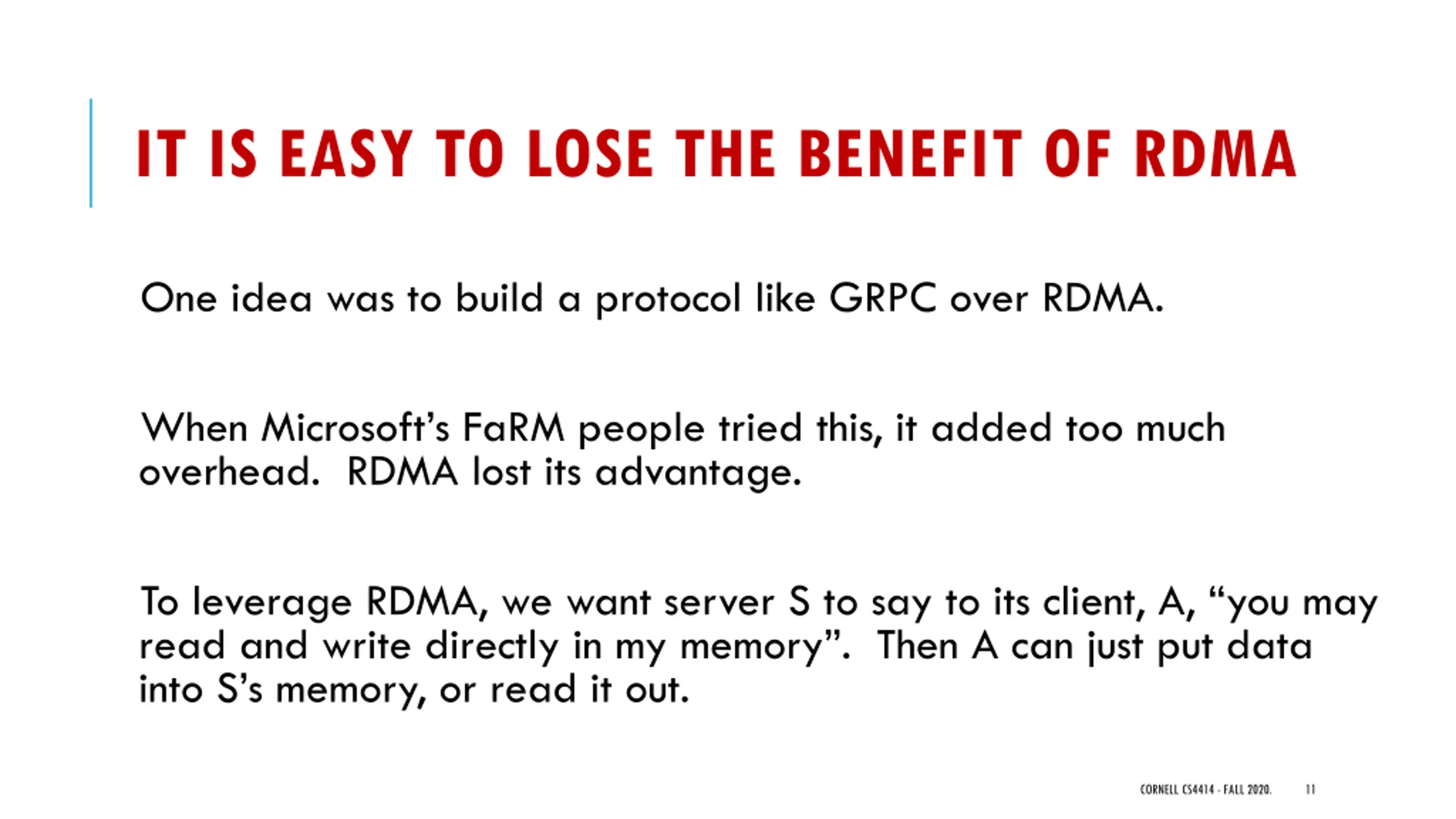 IT IS EASY TO LOSE THE BENEFIT OF RDMA One idea was to build a protocol like GRPC over RDMA. When Microsoft s FaRM people tried this, it added too much overhead. RDMA lost its advantage. To leverage RDMA, we want server S to say to its client, A, you may read and write directly in my memory . Then A can just put data into S s memory, or read it out. CORNELL CS4414 - FALL 2020. 11