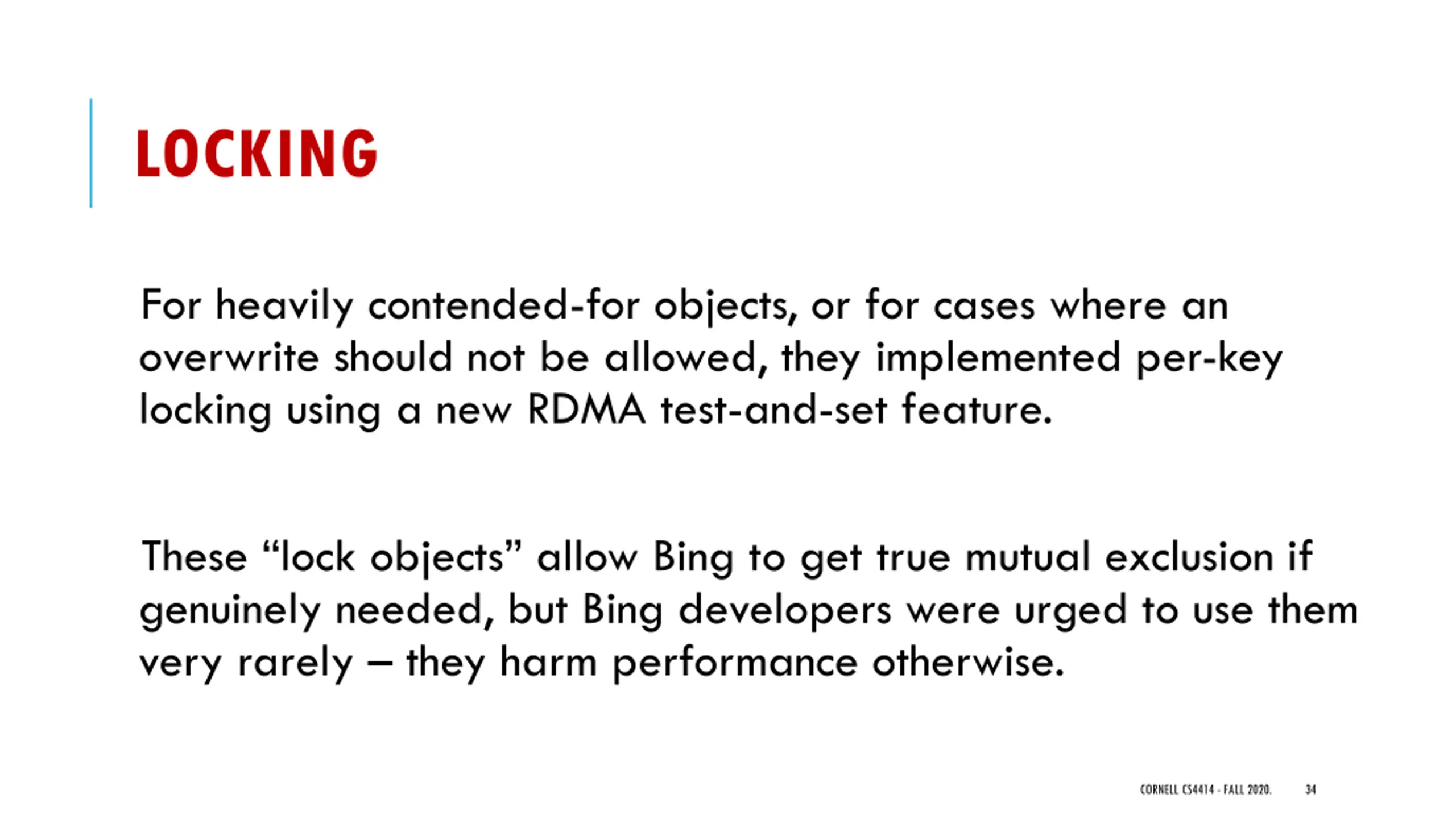 LOCKING For heavily contended-for objects, or for cases where an overwrite should not be allowed, they implemented per-key locking using a new RDMA test-and-set feature. These lock objects allow Bing to get true mutual exclusion if genuinely needed, but Bing developers were urged to use them very rarely they harm performance otherwise. CORNELL CS4414 - FALL 2020. 34