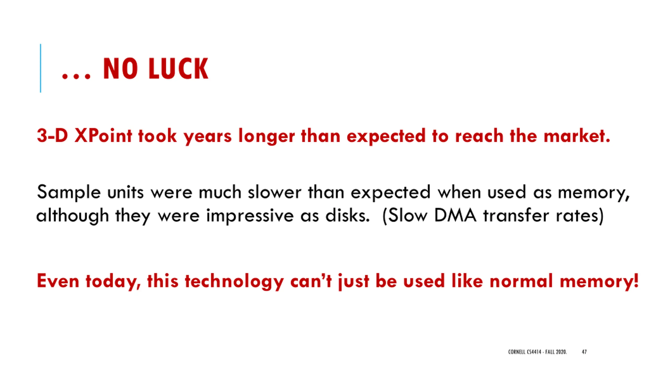 NO LUCK 3-D XPoint took years longer than expected to reach the market. Sample units were much slower than expected when used as memory, although they were impressive as disks. (Slow DMA transfer rates) Even today, this technology can t just be used like normal memory! CORNELL CS4414 - FALL 2020. 47