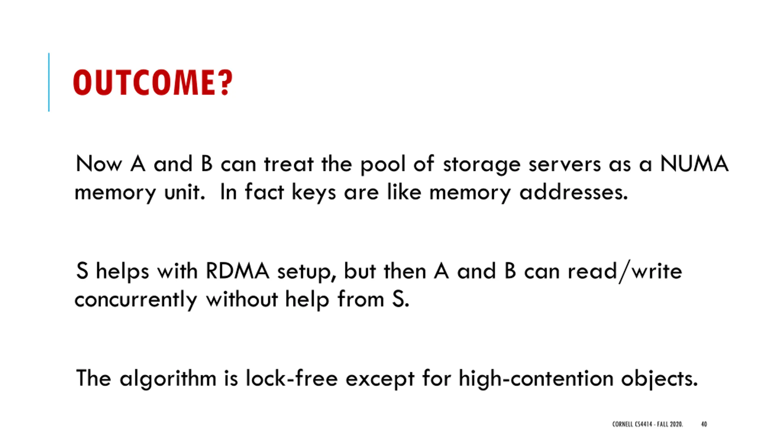 OUTCOME? Now A and B can treat the pool of storage servers as a NUMA memory unit. In fact keys are like memory addresses. S helps with RDMA setup, but then A and B can read/write concurrently without help from S. The algorithm is lock-free except for high-contention objects. CORNELL CS4414 - FALL 2020. 40