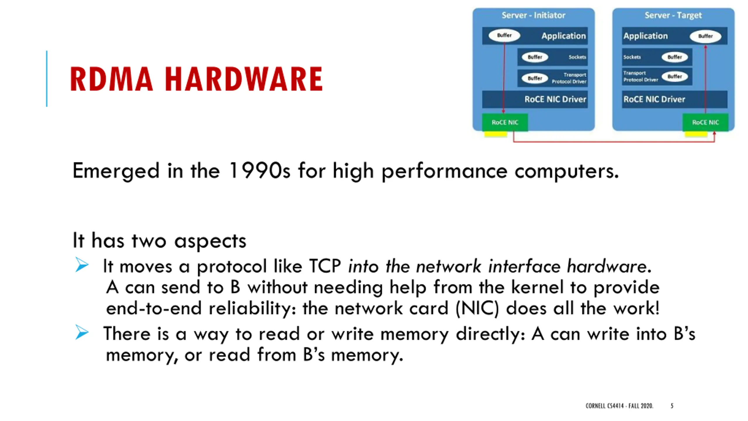 A FEW OBSERVATIONS THEY MADE The felt they should try to leverage new kinds of hardware. The specific option that interested them was remote direct memory access networking, also called RDMA. RDMA makes the whole data center into a large NUMA system. All the memory on every machine can potentially be shared over the RDMA network and accessed from any other machine. RDMA had never been used outside of supercomputers CORNELL CS4414 - FALL 2020. 4