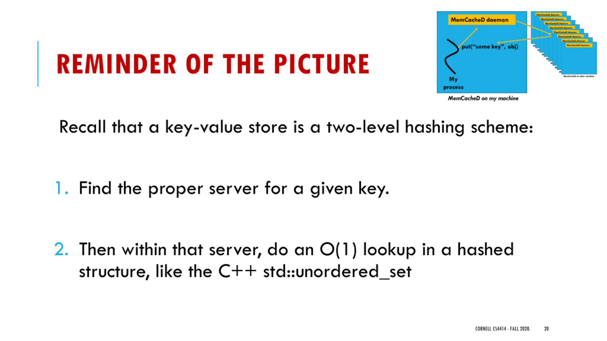 REMINDER OF THE PICTURE Recall that a key-value store is a two-level hashing scheme: 1. Find the proper server for a given key. 2. Then within that server, do an O(1) lookup in a hashed structure, like the C++ std::unordered_set CORNELL CS4414 - FALL 2020. 20