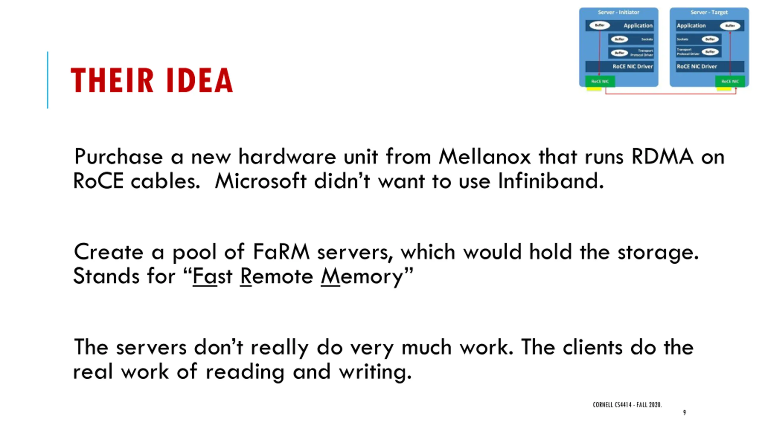 THEIR IDEA Purchase a new hardware unit from Mellanox that runs RDMA on RoCE cables. Microsoft didn t want to use Infiniband. Create a pool of FaRM servers, which would hold the storage. Stands for Fast Remote Memory The servers don t really do very much work. The clients do the real work of reading and writing. CORNELL CS4414 - FALL 2020. 9