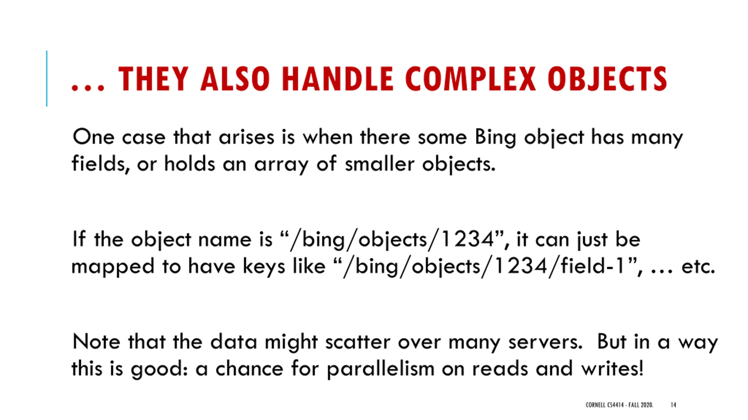 THEY ALSO HANDLE COMPLEX OBJECTS One case that arises is when there some Bing object has many fields, or holds an array of smaller objects. If the object name is /bing/objects/1234 , it can just be mapped to have keys like /bing/objects/1234/field-1 , etc. Note that the data might scatter over many servers. But in a way this is good: a chance for parallelism on reads and writes! CORNELL CS4414 - FALL 2020. 14