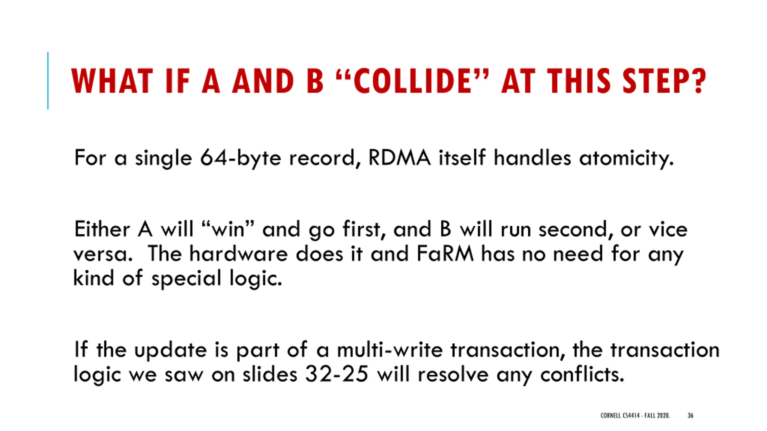 WHAT IF A AND B COLLIDE AT THIS STEP? For a single 64-byte record, RDMA itself handles atomicity. Either A will win and go first, and B will run second, or vice versa. The hardware does it and FaRM has no need for any kind of special logic. If the update is part of a multi-write transaction, the transaction logic we saw on slides 32-25 will resolve any conflicts. CORNELL CS4414 - FALL 2020. 36