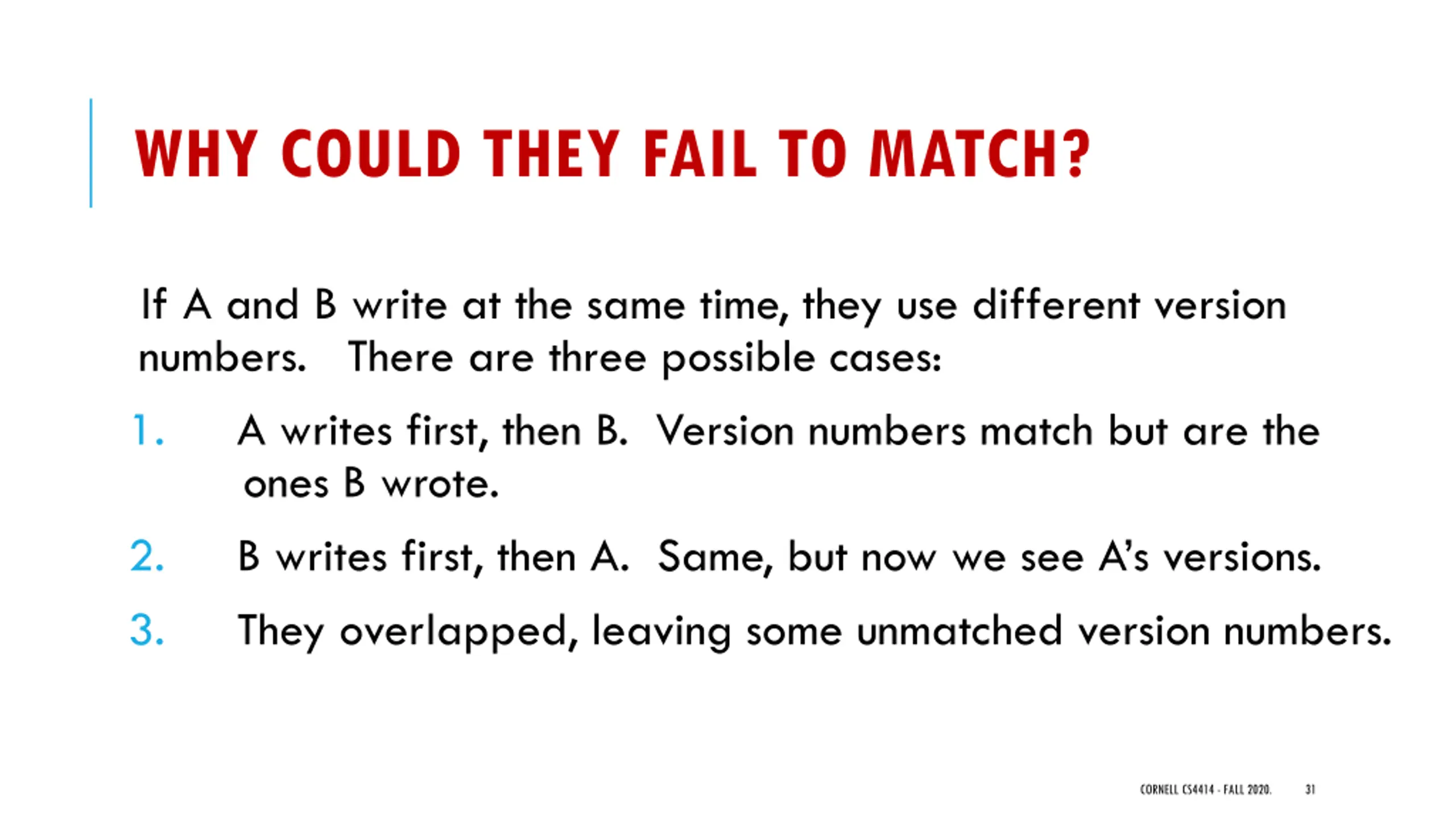 WHY COULD THEY FAIL TO MATCH? If A and B write at the same time, they use different version numbers. There are three possible cases: 1. A writes first, then B. Version numbers match but are the ones B wrote. 2. B writes first, then A. Same, but now we see A s versions. 3. They overlapped, leaving some unmatched version numbers. CORNELL CS4414 - FALL 2020. 31