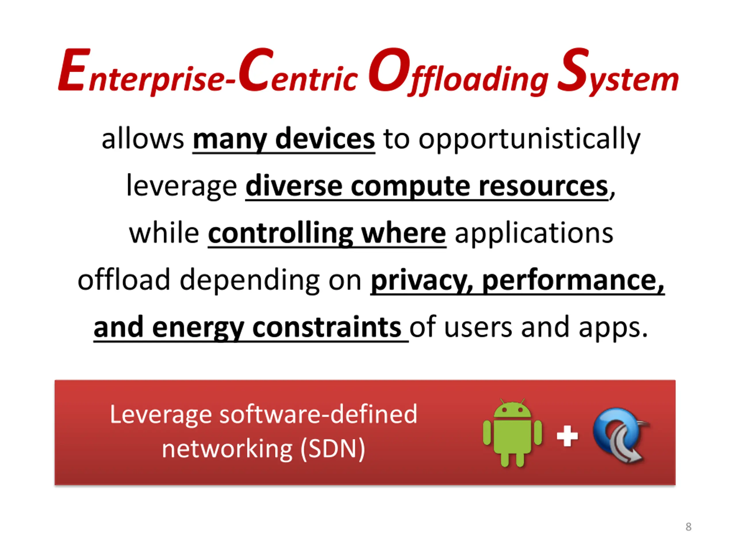 Enterprise-Centric Offloading System allows many devices to opportunistically leverage diverse compute resources, while controlling where applications offload depending on privacy, performance, and energy constraints of users and apps. Leverage software-defined networking (SDN) + + 8