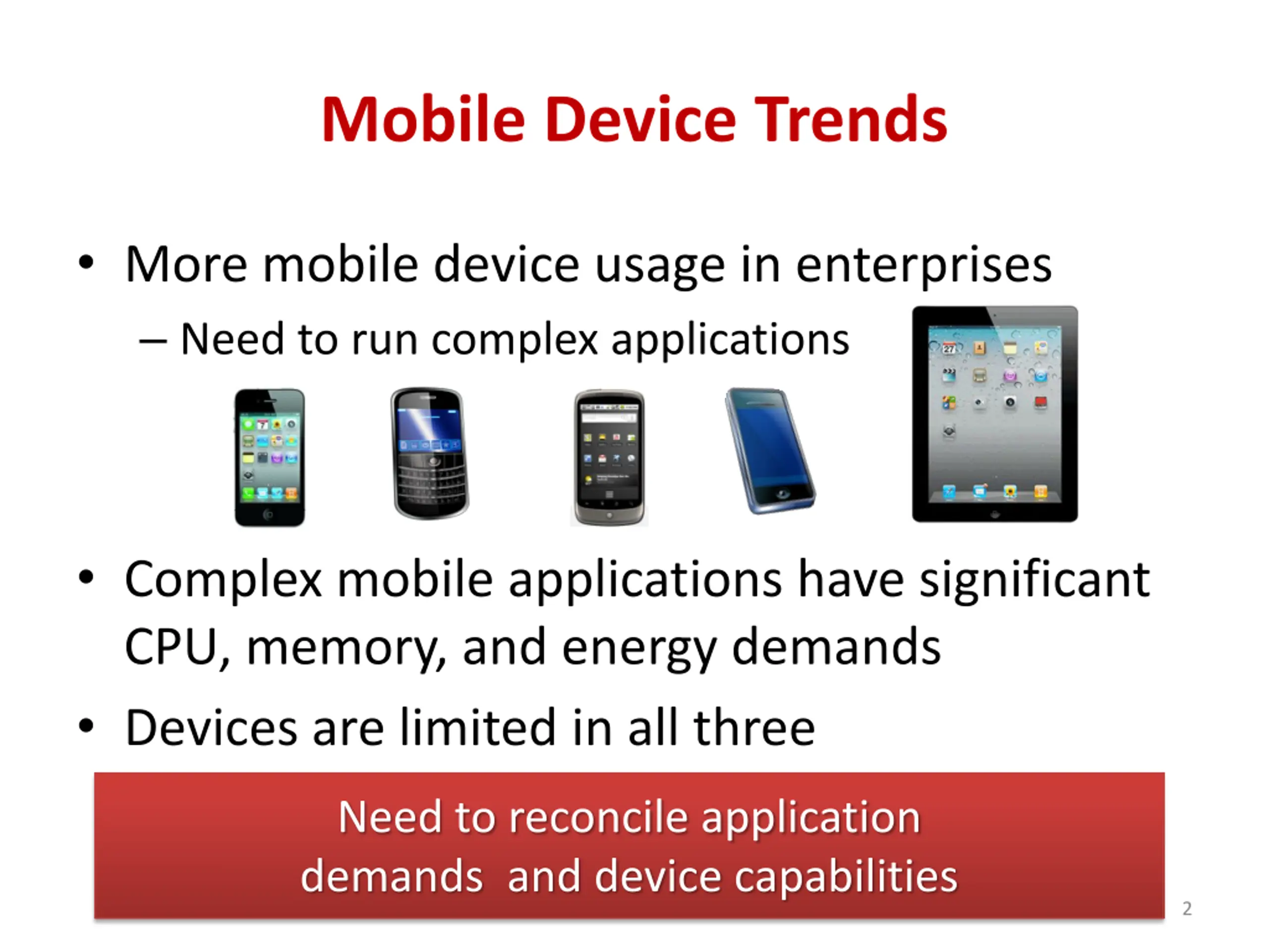 Mobile Device Trends More mobile device usage in enterprises Need to run complex applications Complex mobile applications have significant CPU, memory, and energy demands Devices are limited in all three Need to reconcile application demands and device capabilities 2