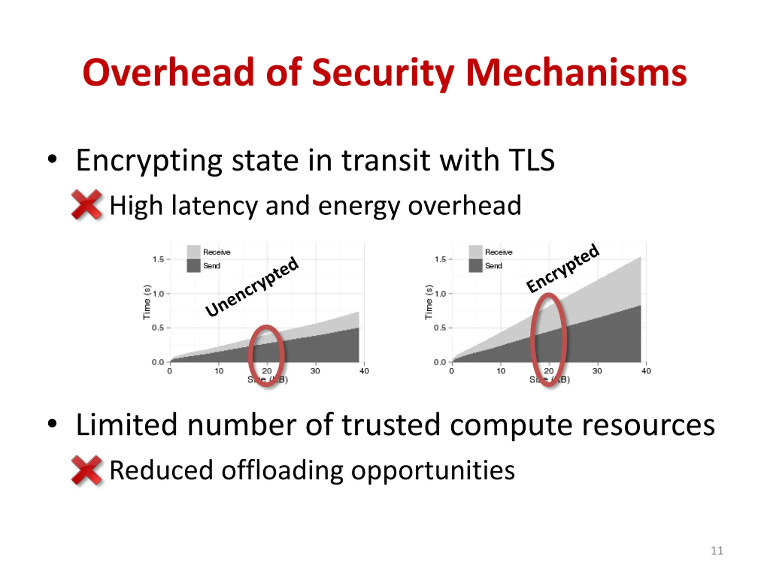Overhead of Security Mechanisms Encrypting state in transit with TLS High latency and energy overhead Limited number of trusted compute resources Reduced offloading opportunities 11
