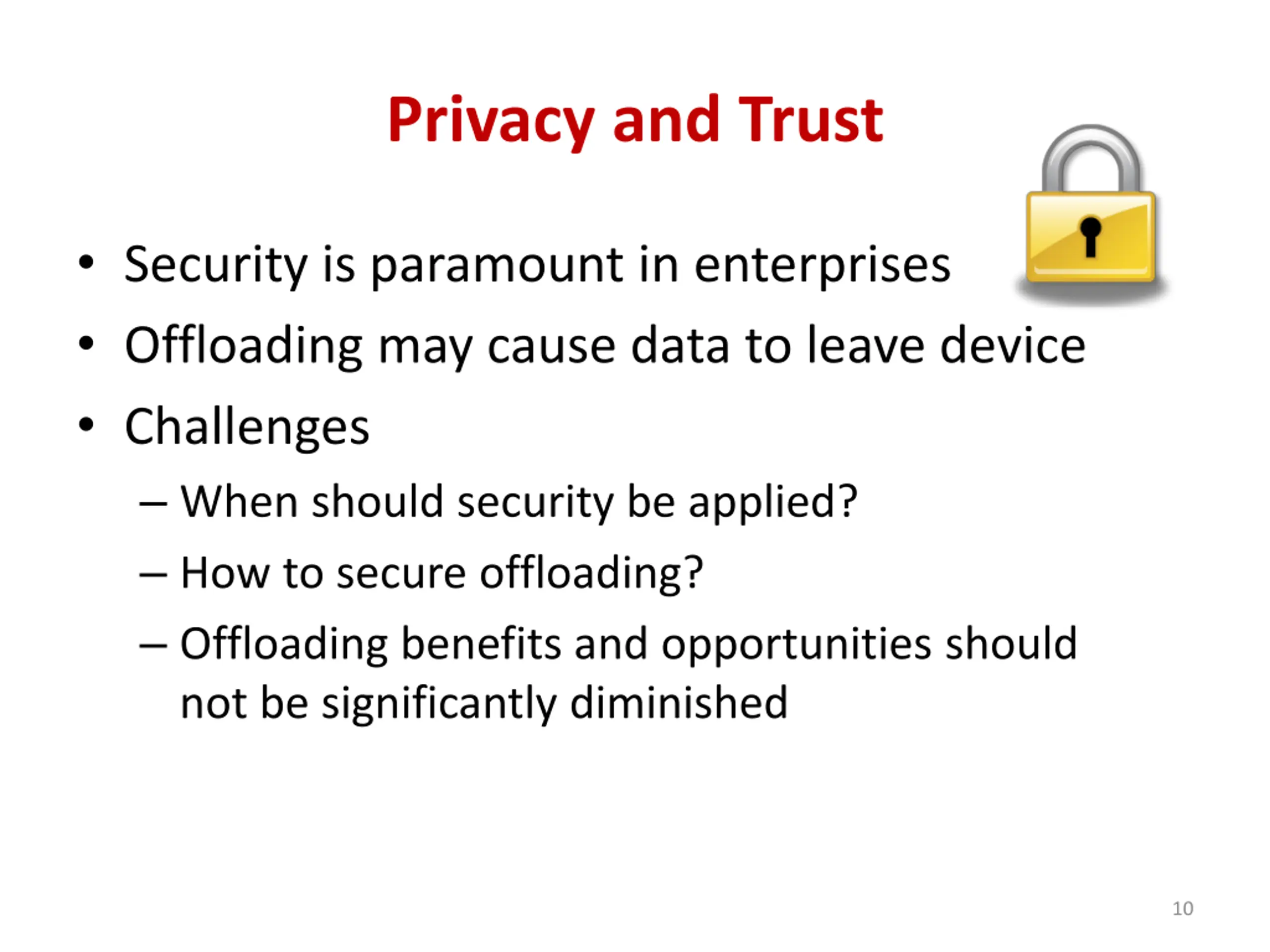 Privacy and Trust Security is paramount in enterprises Offloading may cause data to leave device Challenges When should security be applied? How to secure offloading? Offloading benefits and opportunities should not be significantly diminished 10