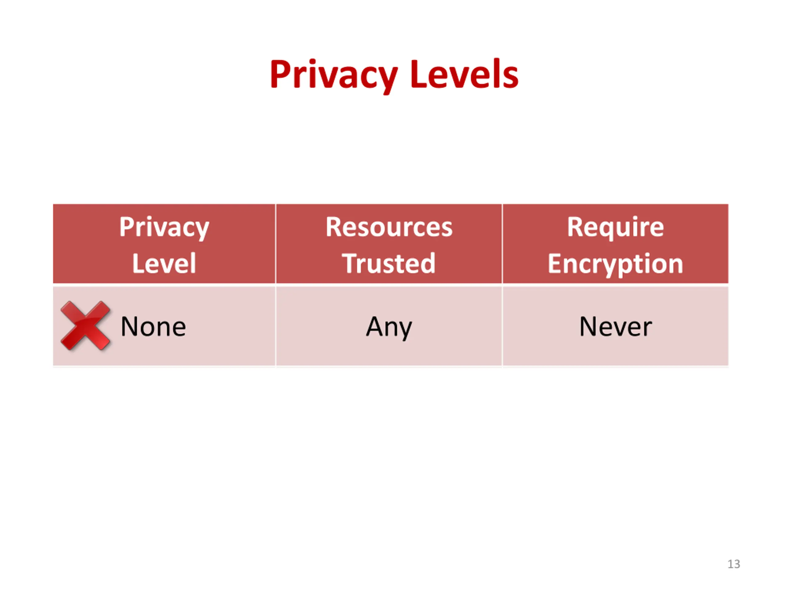 Privacy Levels Privacy Level Resources Trusted Require Encryption None Any Never All internal resources Select servers and desktops Enterprise Never User Always 13