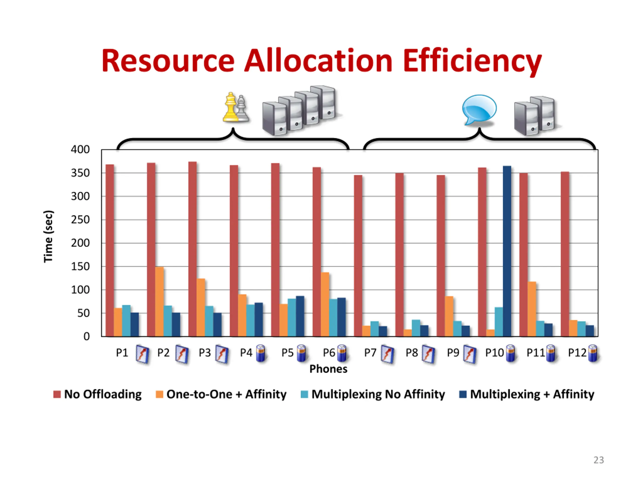 Resource Allocation Efficiency 400 350 300 Time (sec) 250 200 150 100 50 0 P1 P2 P3 P4 P5 P6 P7 P8 P9 P10 P11 P12 Phones No Offloading One-to-One + Affinity Multiplexing No Affinity Multiplexing + Affinity 23