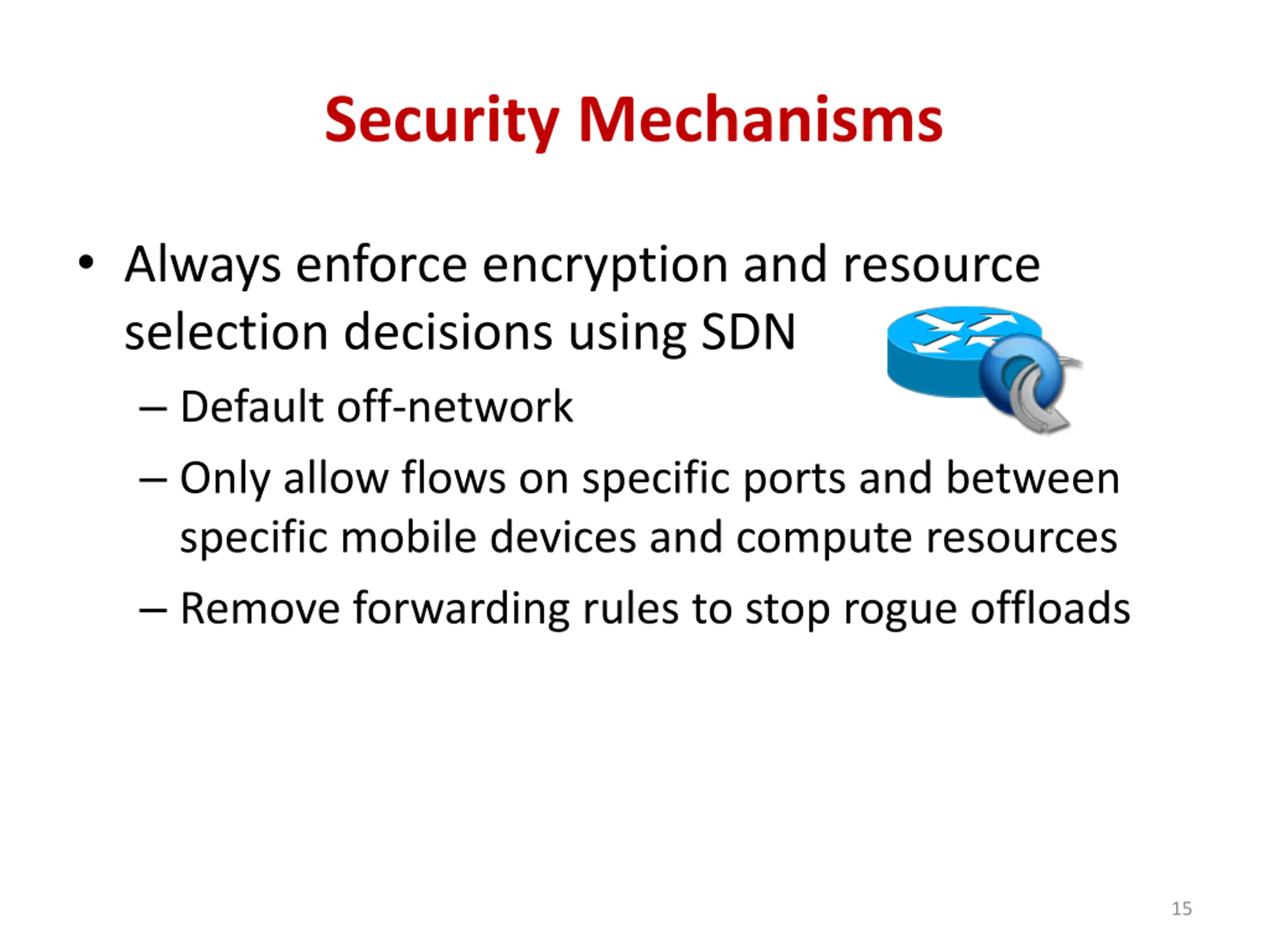 Security Mechanisms Always enforce encryption and resource selection decisions using SDN Default off-network Only allow flows on specific ports and between specific mobile devices and compute resources Remove forwarding rules to stop rogue offloads 15