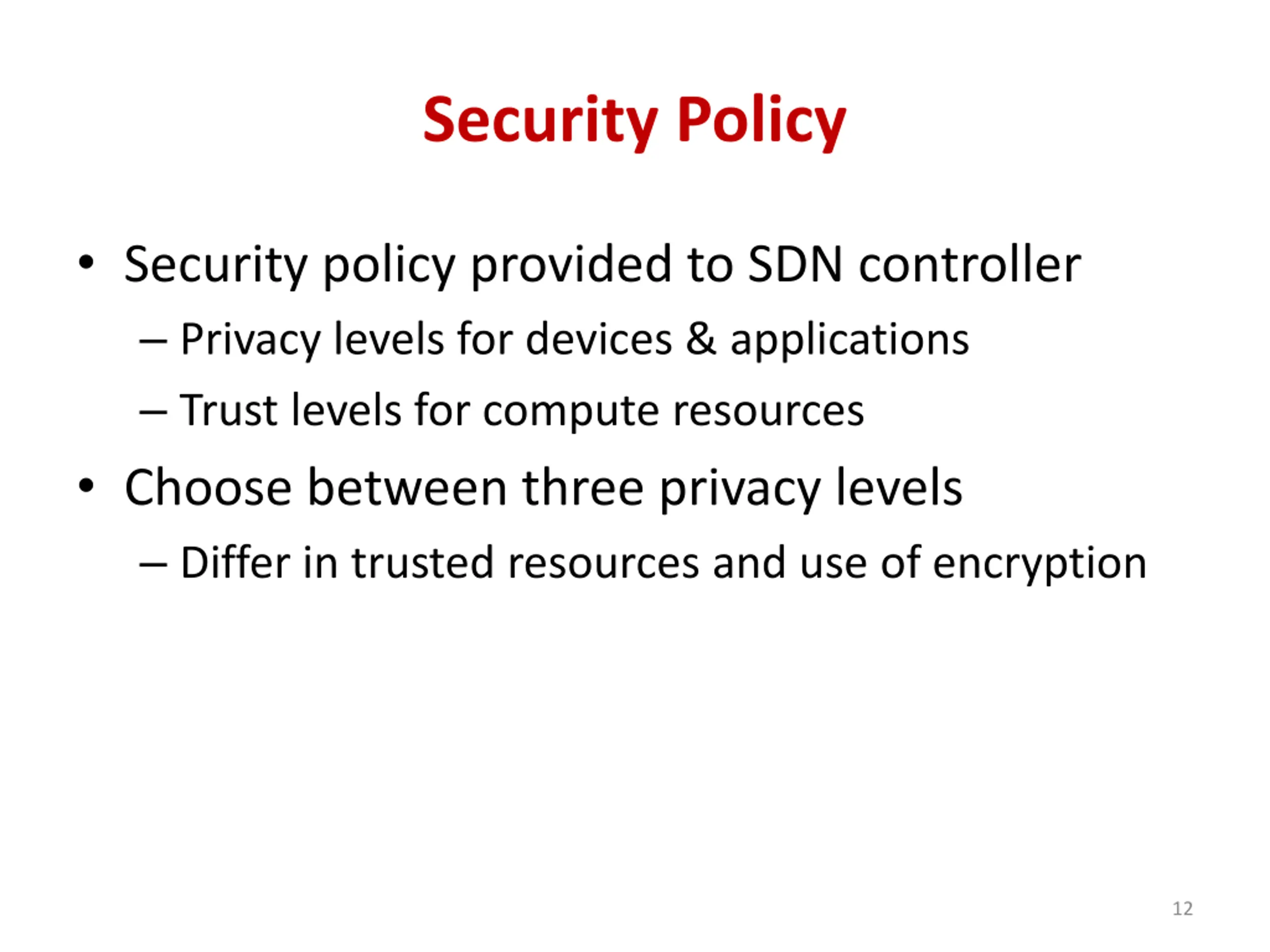 Security Policy Security policy provided to SDN controller Privacy levels for devices & applications Trust levels for compute resources Choose between three privacy levels Differ in trusted resources and use of encryption 12