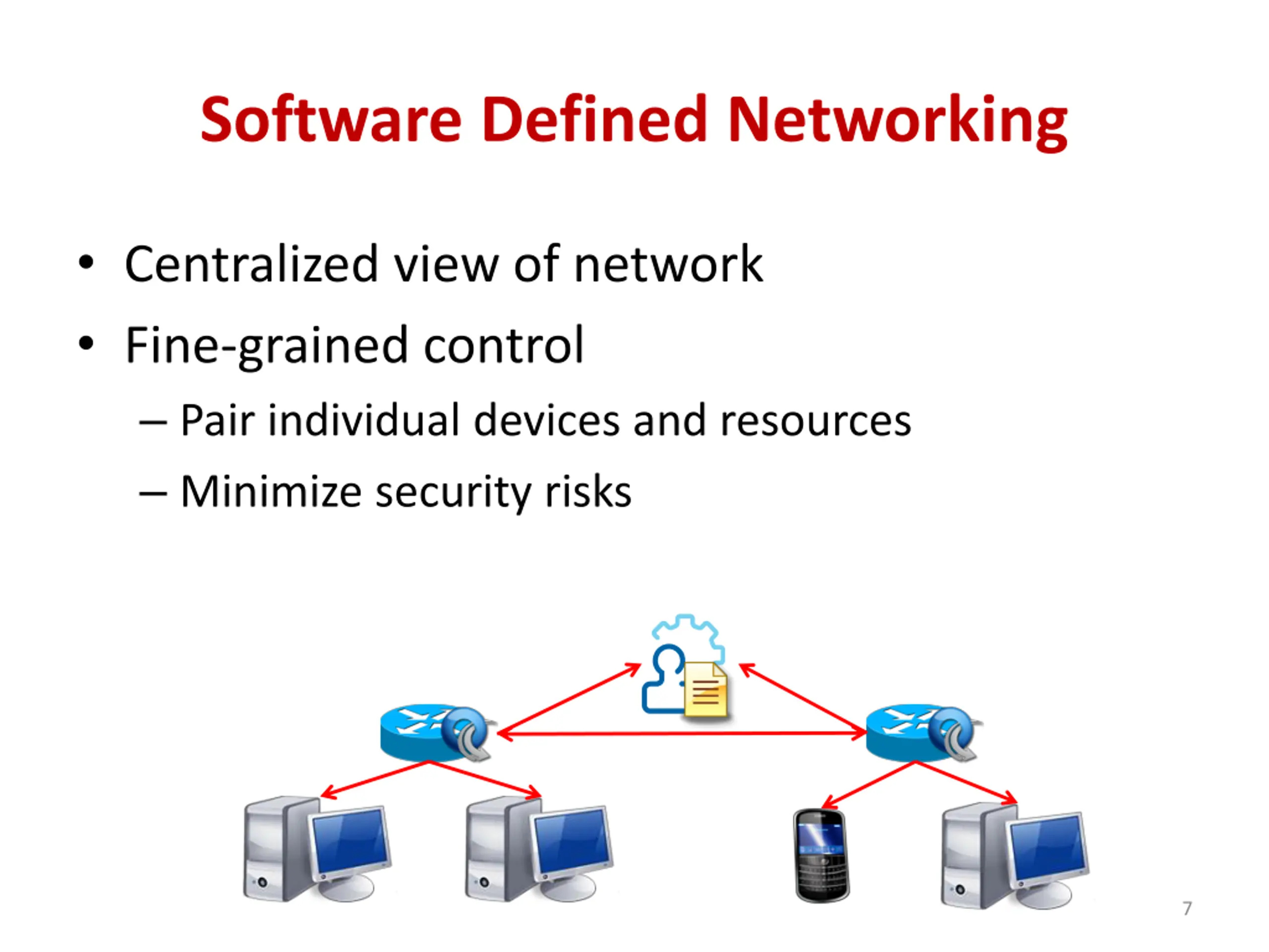 Software Defined Networking Centralized view of network Fine-grained control Pair individual devices and resources Minimize security risks 7