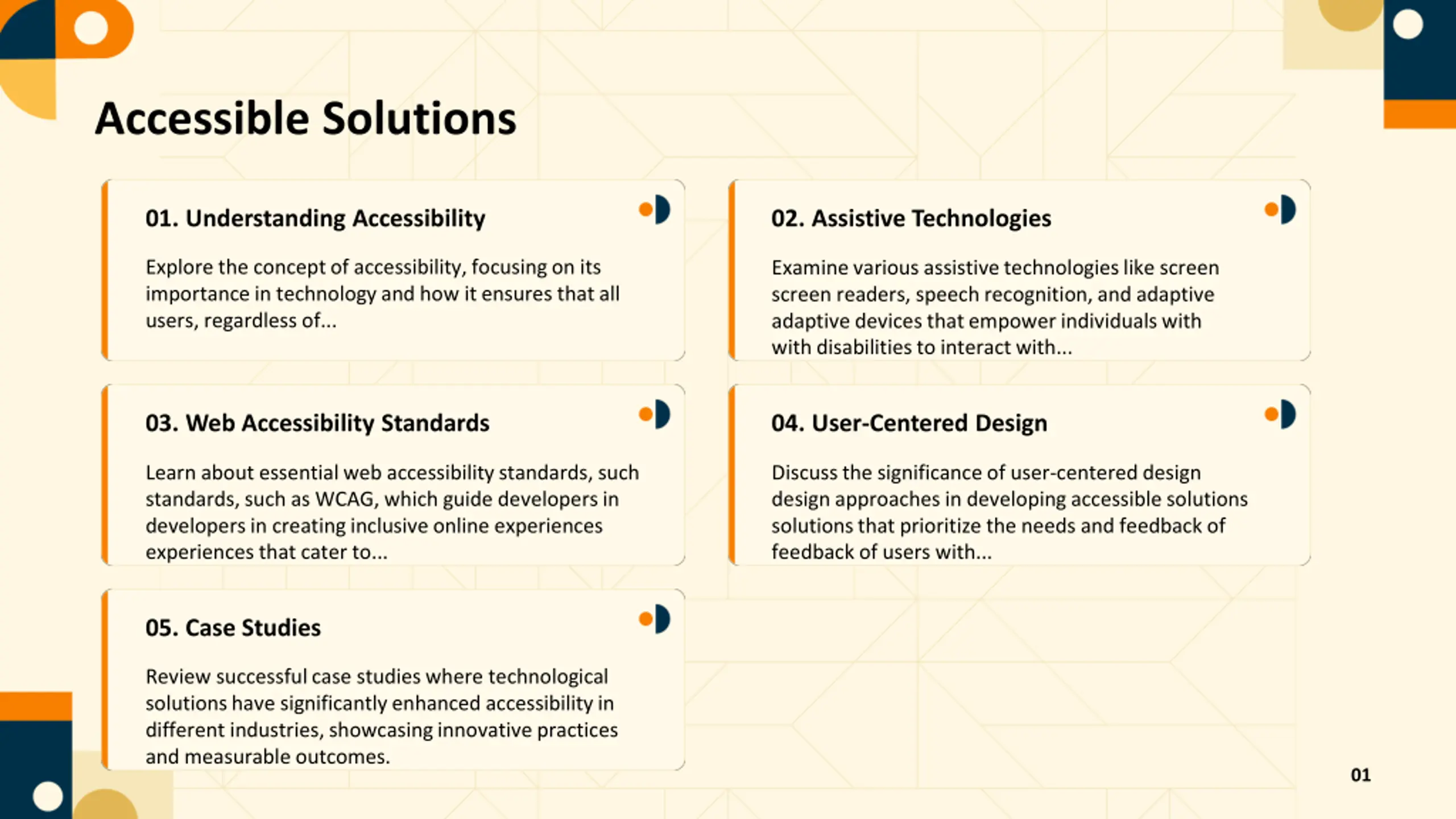 Accessible Solutions 01. Understanding Accessibility 02. Assistive Technologies Explore the concept of accessibility, focusing on its importance in technology and how it ensures that all users, regardless of... Examine various assistive technologies like screen screen readers, speech recognition, and adaptive adaptive devices that empower individuals with with disabilities to interact with... 04. User-Centered Design 03. Web Accessibility Standards Learn about essential web accessibility standards, such standards, such as WCAG, which guide developers in developers in creating inclusive online experiences experiences that cater to... Discuss the significance of user-centered design design approaches in developing accessible solutions solutions that prioritize the needs and feedback of feedback of users with... 05. Case Studies Review successful case studies where technological solutions have significantly enhanced accessibility in different industries, showcasing innovative practices and measurable outcomes. 01