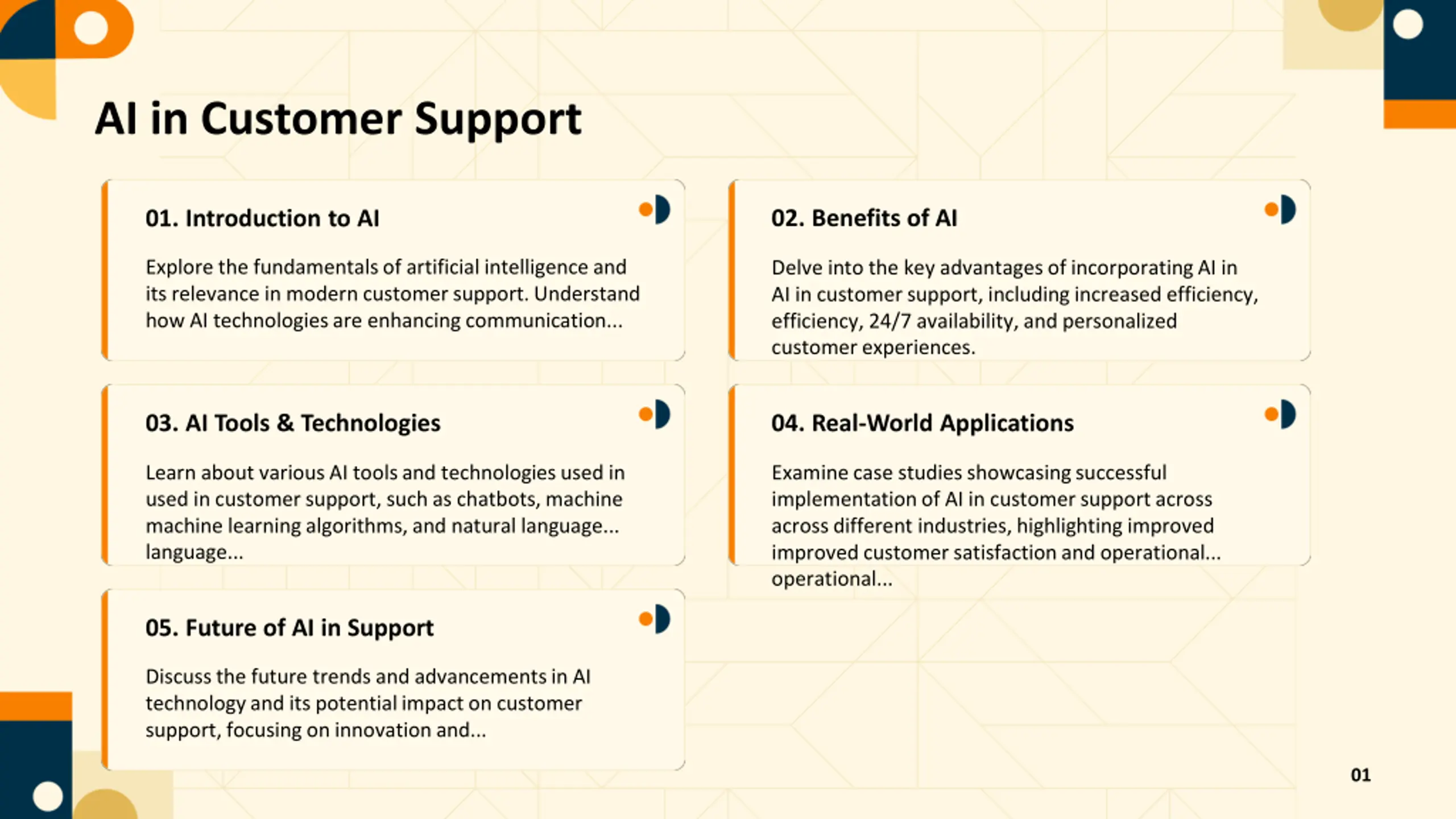AI in Customer Support 02. Benefits of AI 01. Introduction to AI Explore the fundamentals of artificial intelligence and its relevance in modern customer support. Understand how AI technologies are enhancing communication... Delve into the key advantages of incorporating AI in AI in customer support, including increased efficiency, efficiency, 24/7 availability, and personalized customer experiences. 03. AI Tools & Technologies 04. Real-World Applications Learn about various AI tools and technologies used in used in customer support, such as chatbots, machine machine learning algorithms, and natural language... language... Examine case studies showcasing successful implementation of AI in customer support across across different industries, highlighting improved improved customer satisfaction and operational... operational... 05. Future of AI in Support Discuss the future trends and advancements in AI technology and its potential impact on customer support, focusing on innovation and... 01