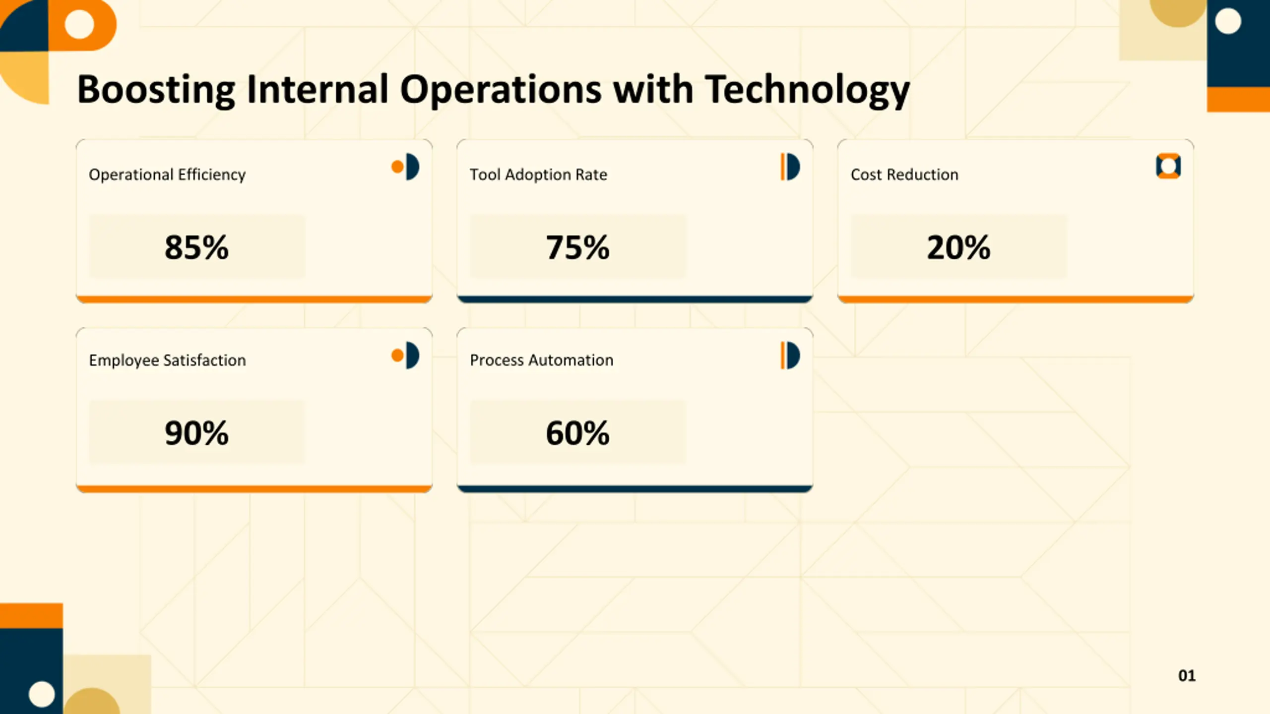 Boosting Internal Operations with Technology Operational Efficiency Tool Adoption Rate Cost Reduction 85% 75% 20% Process Automation Employee Satisfaction 90% 60% 01