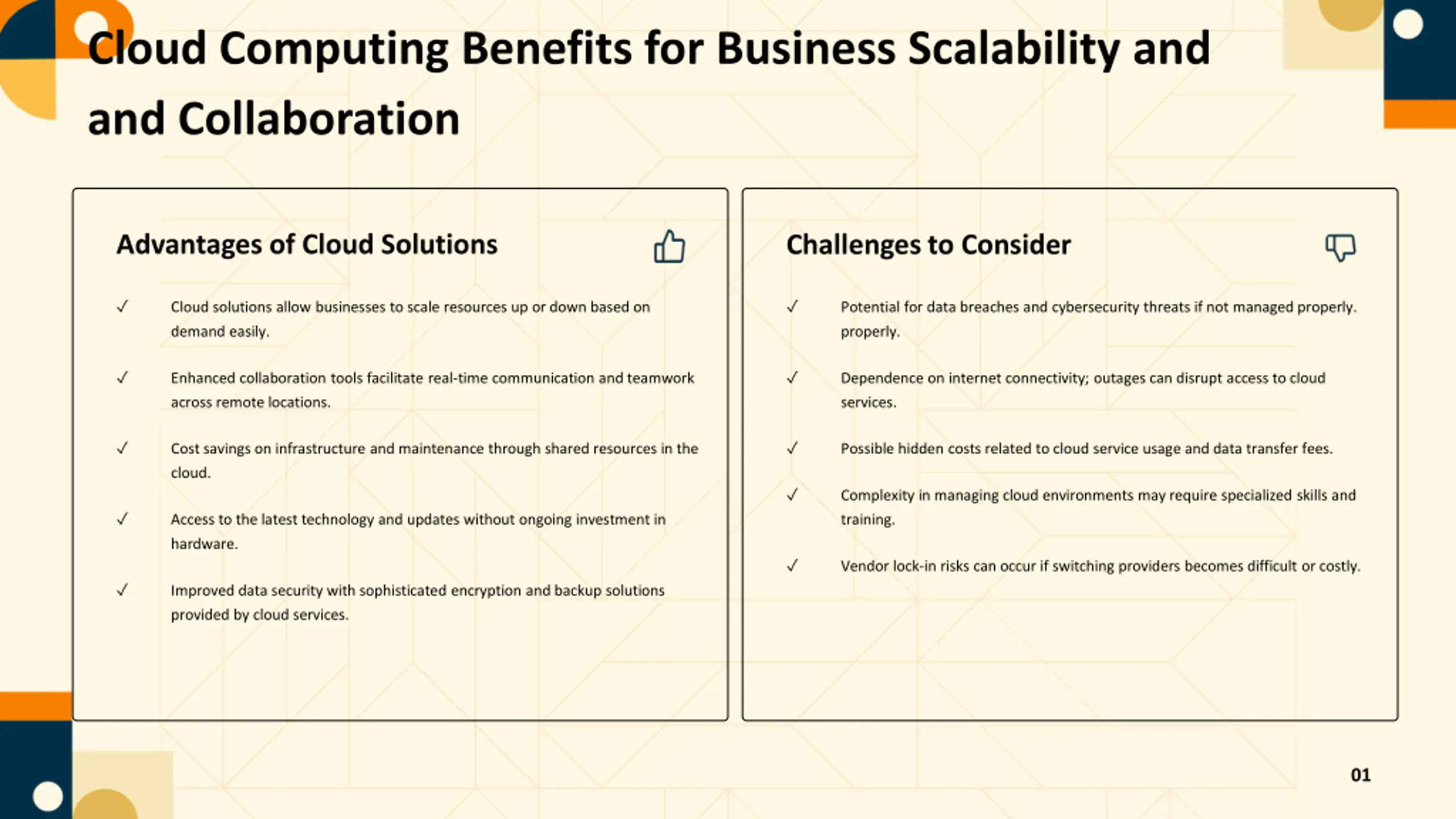 Cloud Computing Benefits for Business Scalability and and Collaboration Advantages of Cloud Solutions Challenges to Consider Cloud solutions allow businesses to scale resources up or down based on demand easily. Potential for data breaches and cybersecurity threats if not managed properly. properly. Enhanced collaboration tools facilitate real-time communication and teamwork across remote locations. Dependence on internet connectivity; outages can disrupt access to cloud services. Cost savings on infrastructure and maintenance through shared resources in the cloud. Possible hidden costs related to cloud service usage and data transfer fees. Complexity in managing cloud environments may require specialized skills and training. Access to the latest technology and updates without ongoing investment in hardware. Vendor lock-in risks can occur if switching providers becomes difficult or costly. Improved data security with sophisticated encryption and backup solutions provided by cloud services. 01