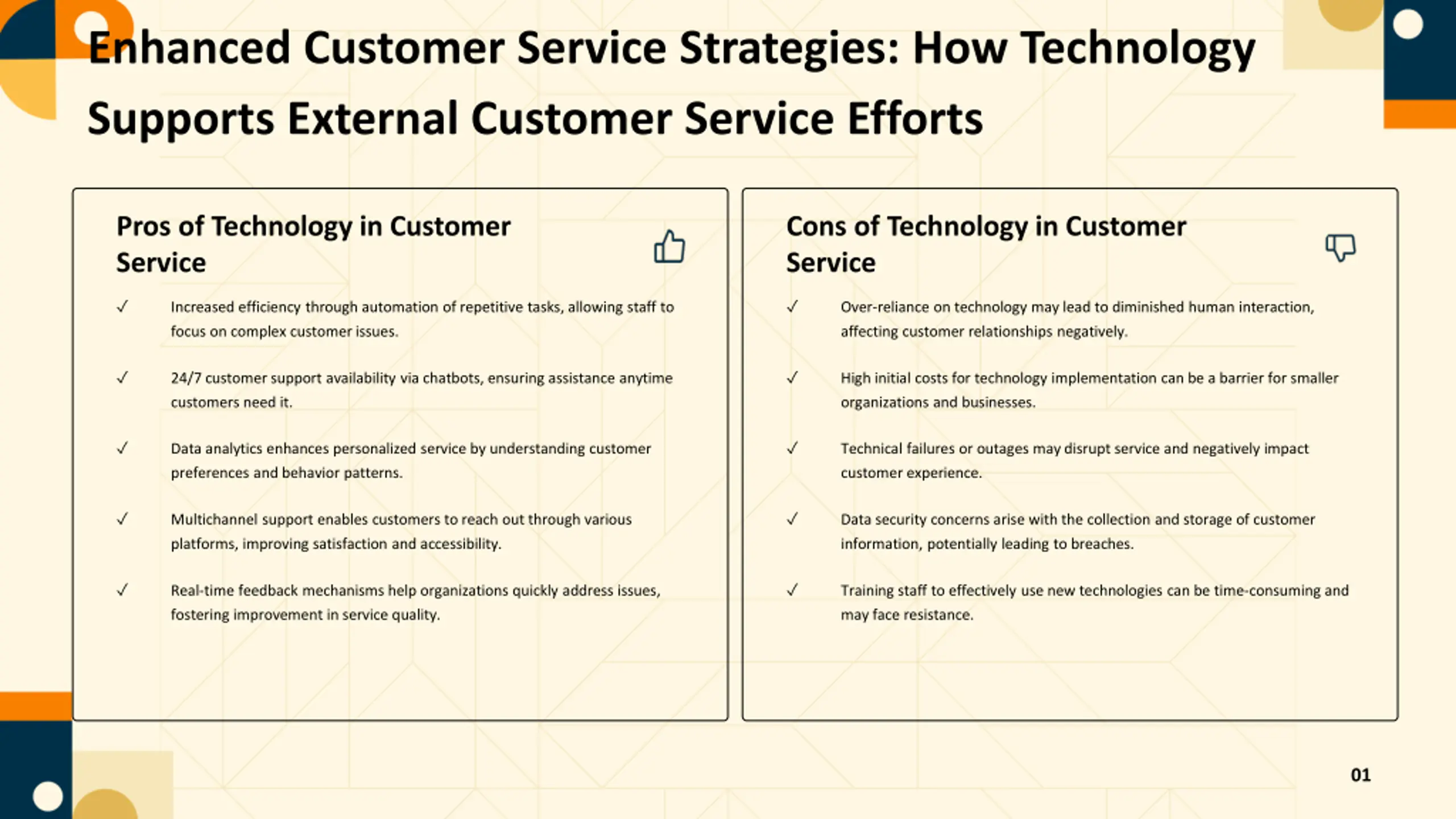 Enhanced Customer Service Strategies: How Technology Supports External Customer Service Efforts Pros of Technology in Customer Service Cons of Technology in Customer Service Increased efficiency through automation of repetitive tasks, allowing staff to focus on complex customer issues. Over-reliance on technology may lead to diminished human interaction, affecting customer relationships negatively. 24/7 customer support availability via chatbots, ensuring assistance anytime customers need it. High initial costs for technology implementation can be a barrier for smaller organizations and businesses. Data analytics enhances personalized service by understanding customer preferences and behavior patterns. Technical failures or outages may disrupt service and negatively impact customer experience. Multichannel support enables customers to reach out through various platforms, improving satisfaction and accessibility. Data security concerns arise with the collection and storage of customer information, potentially leading to breaches. Real-time feedback mechanisms help organizations quickly address issues, fostering improvement in service quality. Training staff to effectively use new technologies can be time-consuming and may face resistance. 01