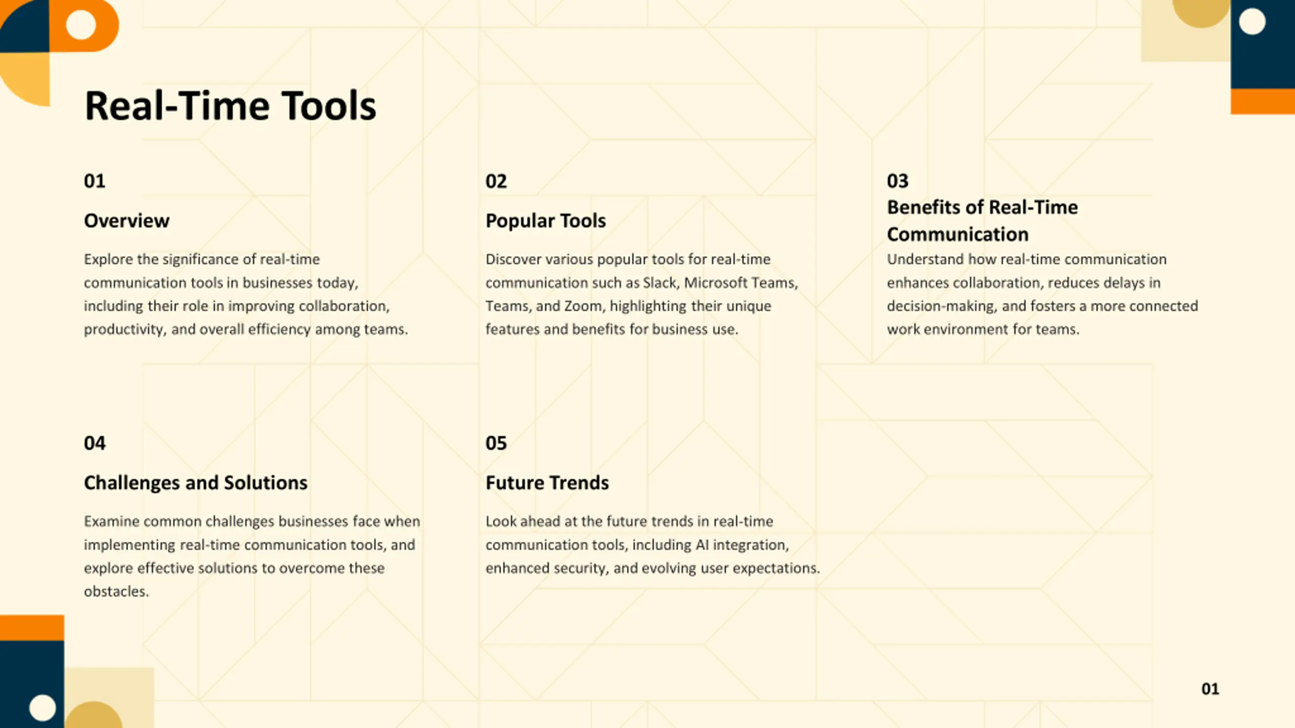Real-Time Tools 01 03 Benefits of Real-Time Communication Understand how real-time communication enhances collaboration, reduces delays in decision-making, and fosters a more connected work environment for teams. 02 Popular Tools Overview Explore the significance of real-time communication tools in businesses today, including their role in improving collaboration, productivity, and overall efficiency among teams. Discover various popular tools for real-time communication such as Slack, Microsoft Teams, Teams, and Zoom, highlighting their unique features and benefits for business use. 04 05 Challenges and Solutions Future Trends Examine common challenges businesses face when implementing real-time communication tools, and explore effective solutions to overcome these obstacles. Look ahead at the future trends in real-time communication tools, including AI integration, enhanced security, and evolving user expectations. 01