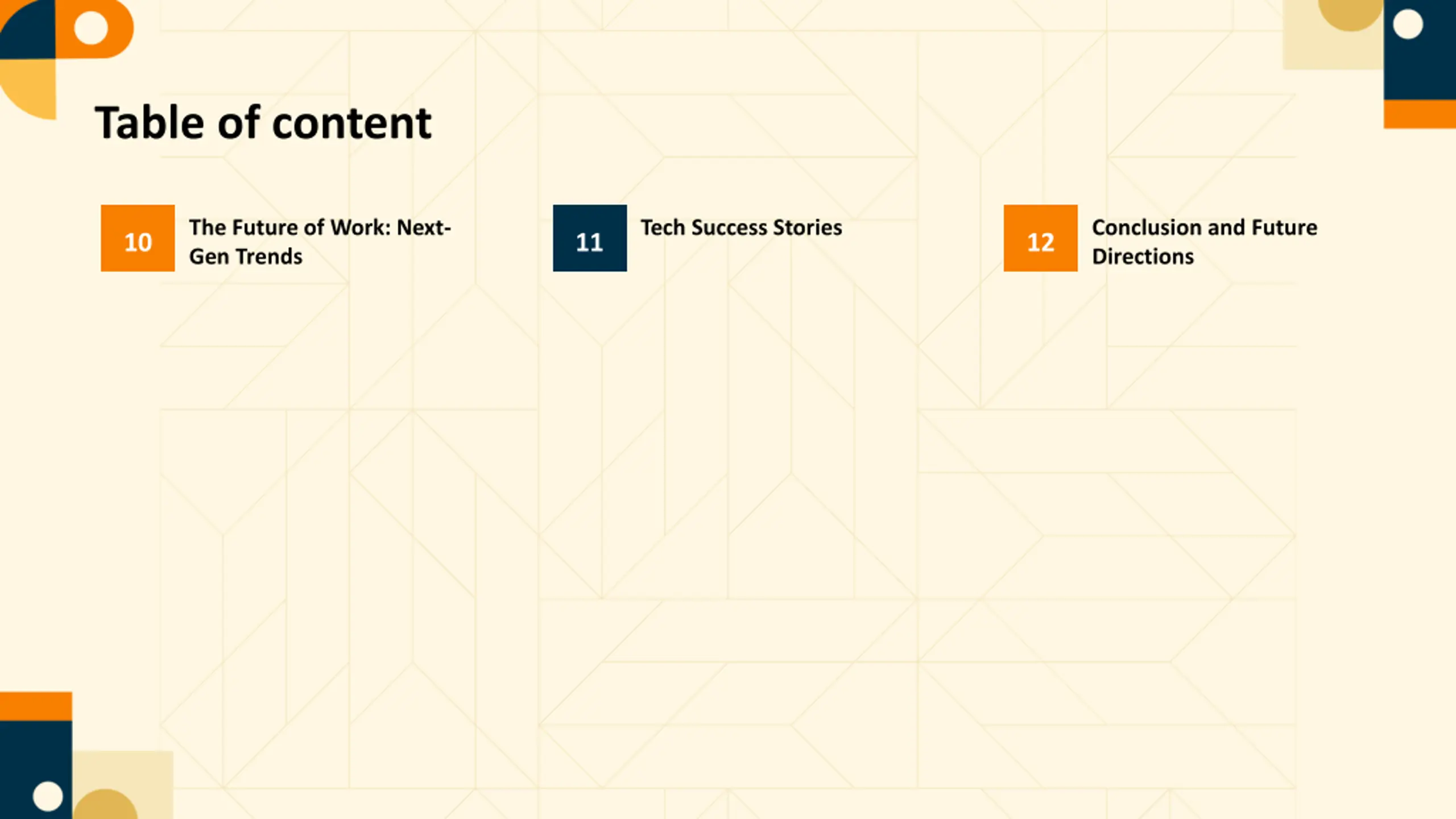 Table of content The Future of Work: Next- Gen Trends Tech Success Stories Conclusion and Future Directions 10 11 12