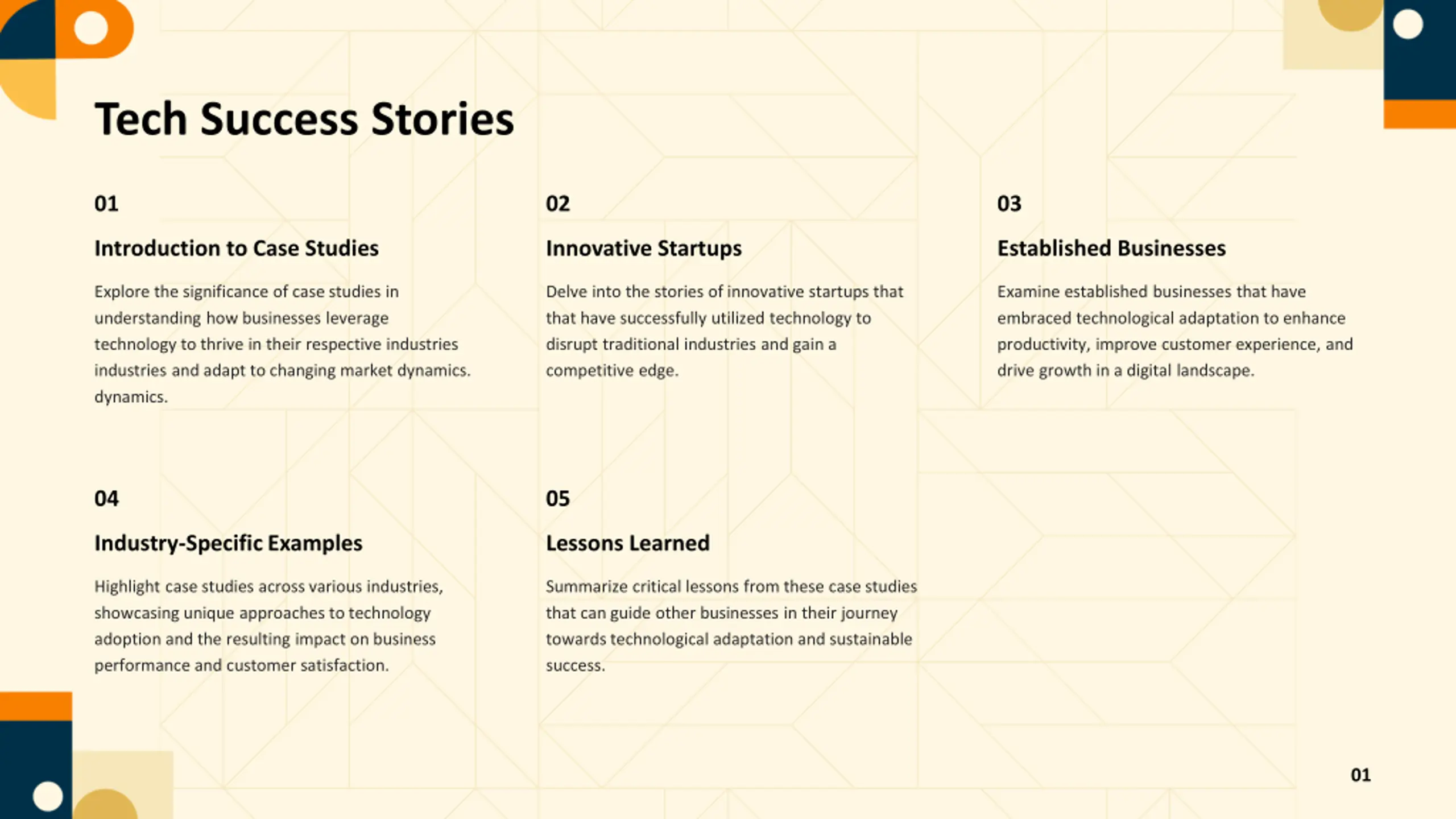 Tech Success Stories 01 02 03 Introduction to Case Studies Innovative Startups Established Businesses Explore the significance of case studies in understanding how businesses leverage technology to thrive in their respective industries industries and adapt to changing market dynamics. dynamics. Delve into the stories of innovative startups that that have successfully utilized technology to disrupt traditional industries and gain a competitive edge. Examine established businesses that have embraced technological adaptation to enhance productivity, improve customer experience, and drive growth in a digital landscape. 04 05 Industry-Specific Examples Lessons Learned Highlight case studies across various industries, showcasing unique approaches to technology adoption and the resulting impact on business performance and customer satisfaction. Summarize critical lessons from these case studies that can guide other businesses in their journey towards technological adaptation and sustainable success. 01