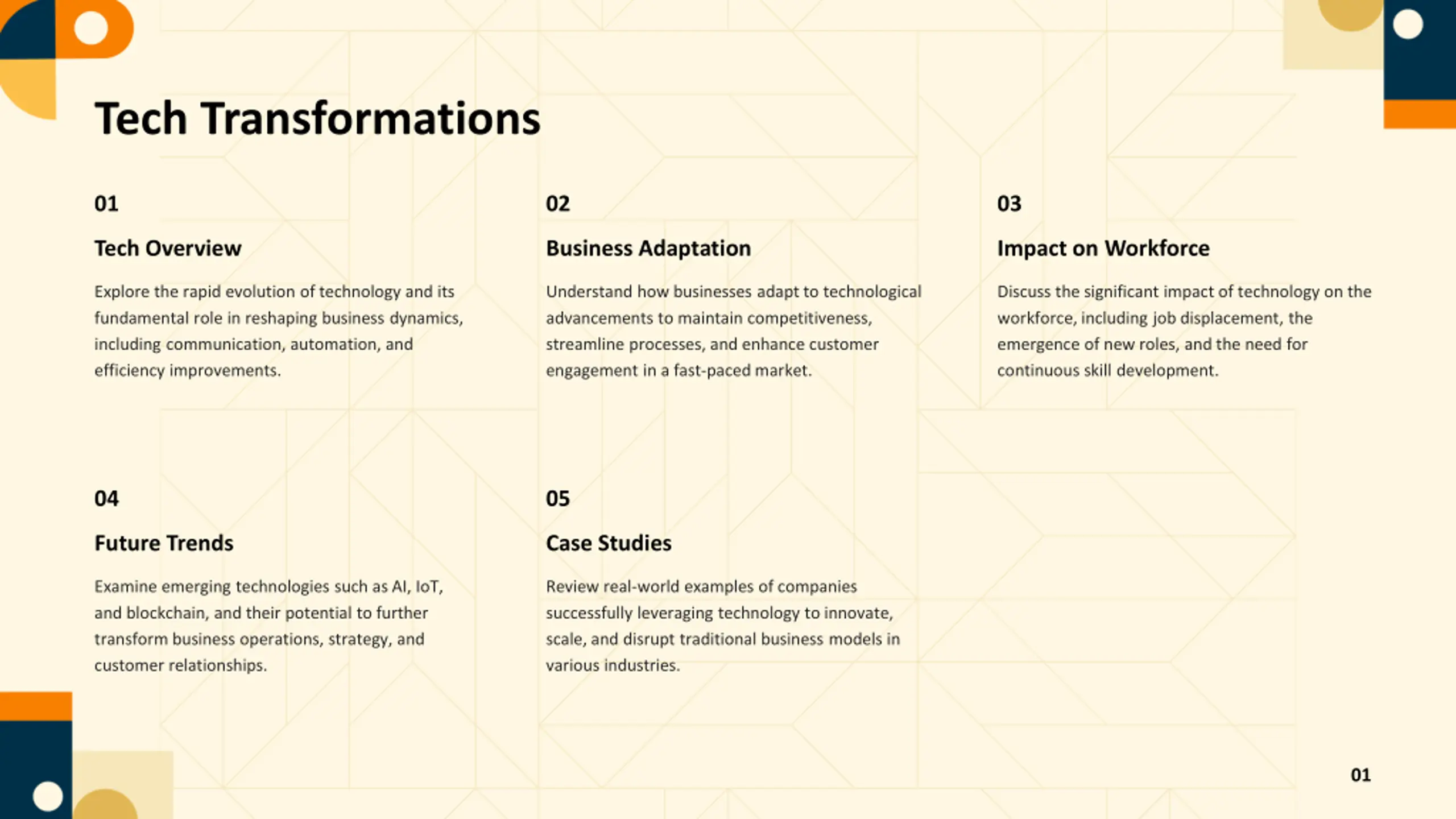 Tech Transformations 01 02 03 Tech Overview Business Adaptation Impact on Workforce Explore the rapid evolution of technology and its fundamental role in reshaping business dynamics, including communication, automation, and efficiency improvements. Understand how businesses adapt to technological advancements to maintain competitiveness, streamline processes, and enhance customer engagement in a fast-paced market. Discuss the significant impact of technology on the workforce, including job displacement, the emergence of new roles, and the need for continuous skill development. 04 05 Future Trends Case Studies Examine emerging technologies such as AI, IoT, and blockchain, and their potential to further transform business operations, strategy, and customer relationships. Review real-world examples of companies successfully leveraging technology to innovate, scale, and disrupt traditional business models in various industries. 01