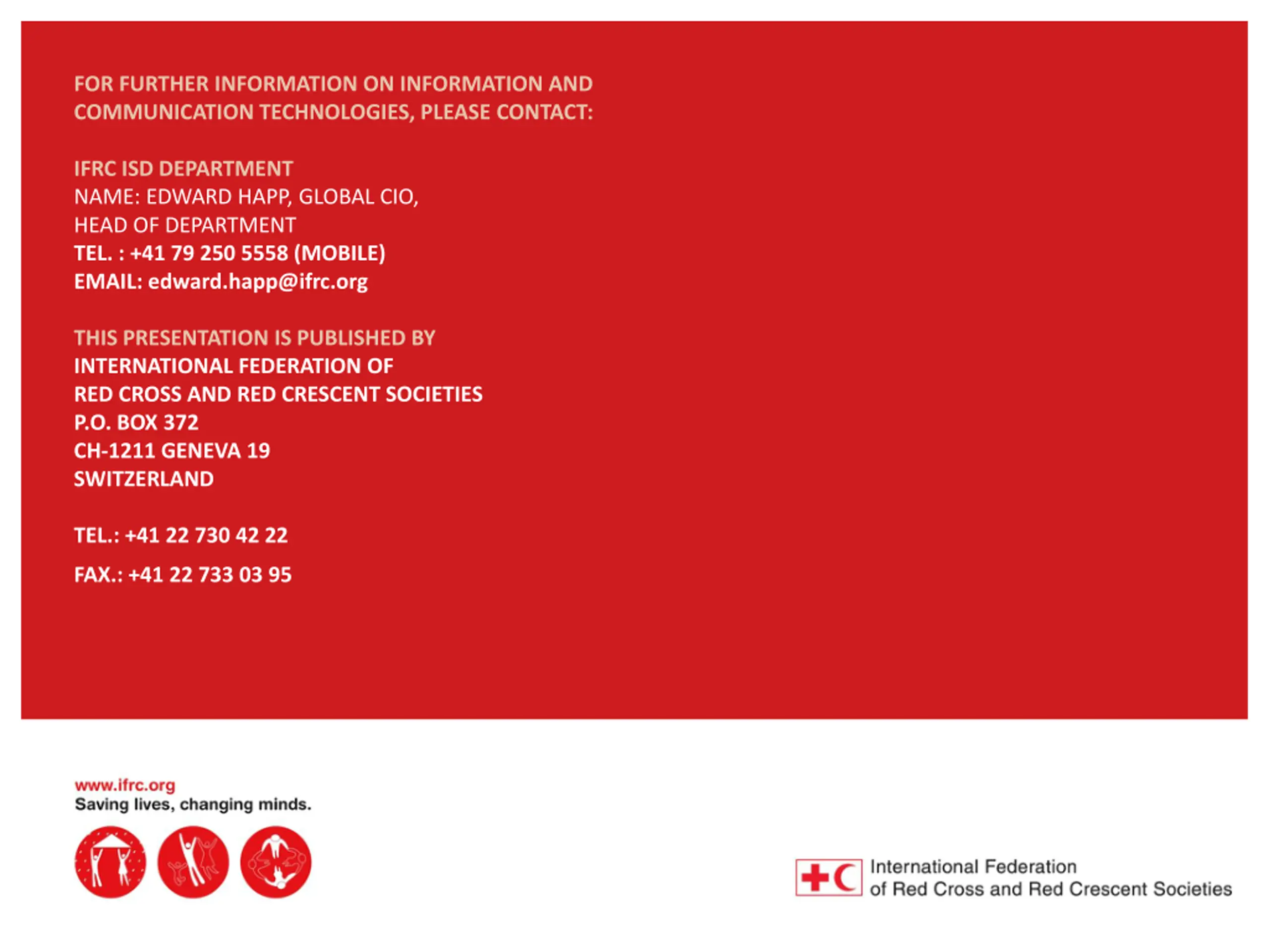 FOR FURTHER INFORMATION ON INFORMATION AND COMMUNICATION TECHNOLOGIES, PLEASE CONTACT: IFRC ISD DEPARTMENT NAME: EDWARD HAPP, GLOBAL CIO, HEAD OF DEPARTMENT TEL. : +41 79 250 5558 (MOBILE) EMAIL: edward.happ@ifrc.org THIS PRESENTATION IS PUBLISHED BY INTERNATIONAL FEDERATION OF RED CROSS AND RED CRESCENT SOCIETIES P.O. BOX 372 CH-1211 GENEVA 19 SWITZERLAND TEL.: +41 22 730 42 22 FAX.: +41 22 733 03 95