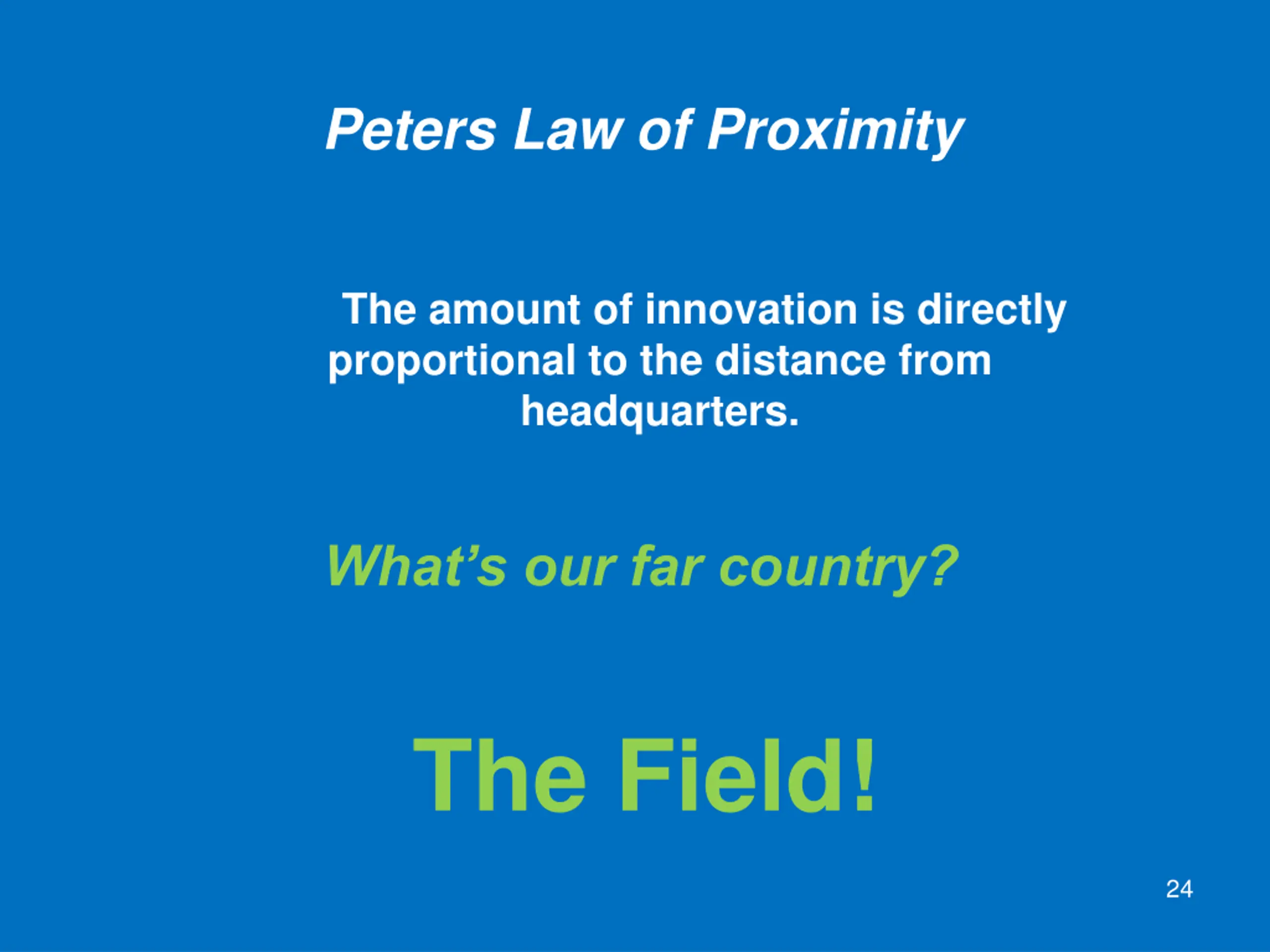 Peters Law of Proximity The amount of innovation is directly proportional to the distance from headquarters. What s our far country? The Field! 24